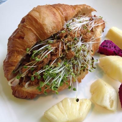 綠藤苜蓿芽、青花椰苗、Cheese片、里肌肉片(或薄豬肉片)、可頌麵包或土司麵包。