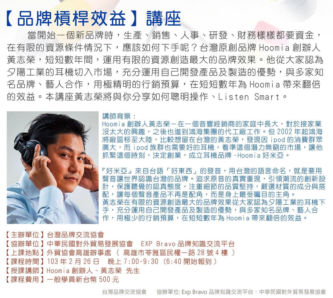 當你要開始一個新品牌時,產銷人發財樣樣都要資金,在有限的資源條件情況下,應該如何下手呢?台灣原創品牌Hoomia創辦人黃志榮,短短數年間,運用有限的資源創造最大的品牌效果。他從大家認為夕陽工業的耳機切入市場,充分運用自己開發產品及製造的優勢,與多家知名品牌、藝人合作,用極精明的行銷預算,在短短數年為Hoomia帶來翻倍的效益。本講座將由Hoomia創辦人黃志榮與大家分享如何聰明操作、Listen Smart!