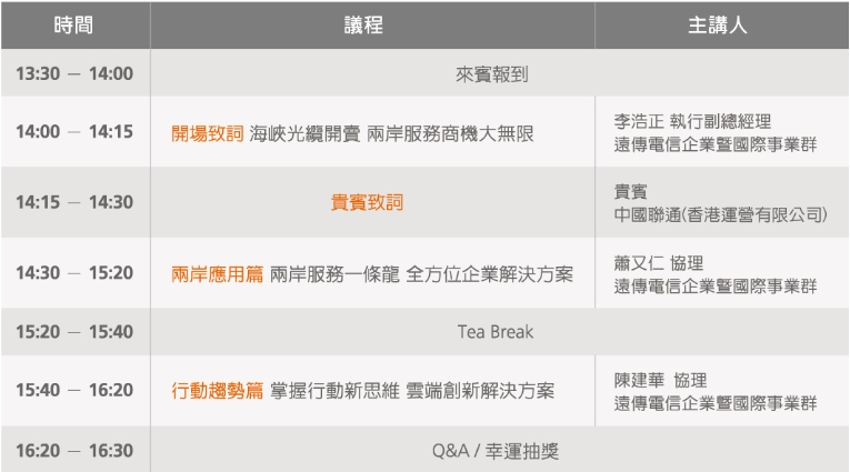遠傳企業暨國際事業群的菁英團隊,在成功取得兩岸海峽光纜(淡水直達福州)的開賣許可後,也同步啟動了兩岸電信服務一條龍的完整配套服務,此次將 在「兩岸商機新動能」說明會中完全公開,以最多元的整合服務讓企業可專注於本業的創新開發及營運提升,真正滿足兩岸同步營運的眾多台商企業的需求。