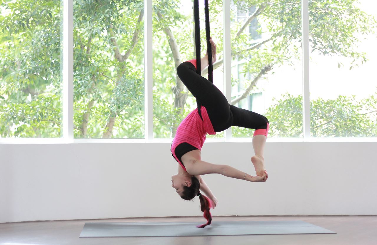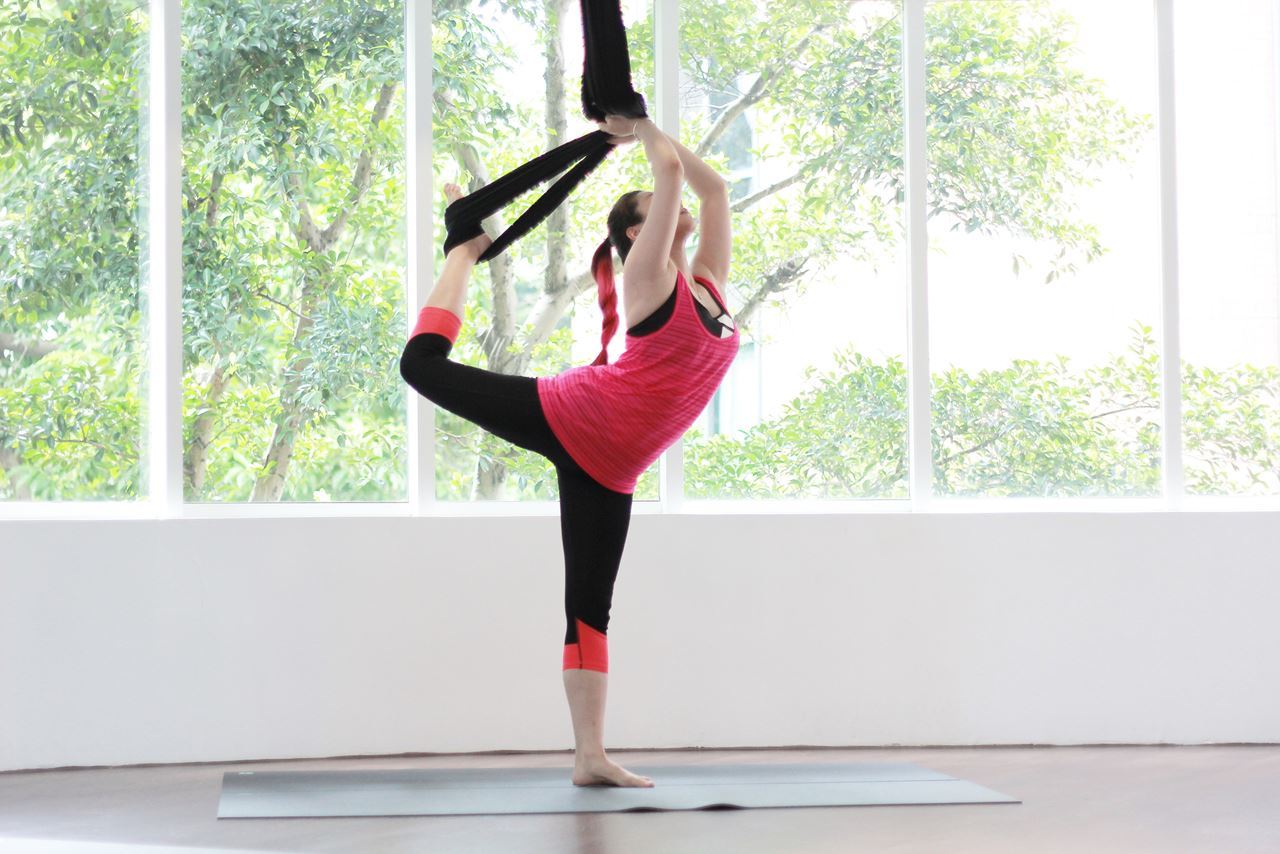 布掛在開放的空間中幫助身體嚐試各個方向上下自由移動的力量,跟著我們體驗各種有趣好玩的空中瑜珈動作!
