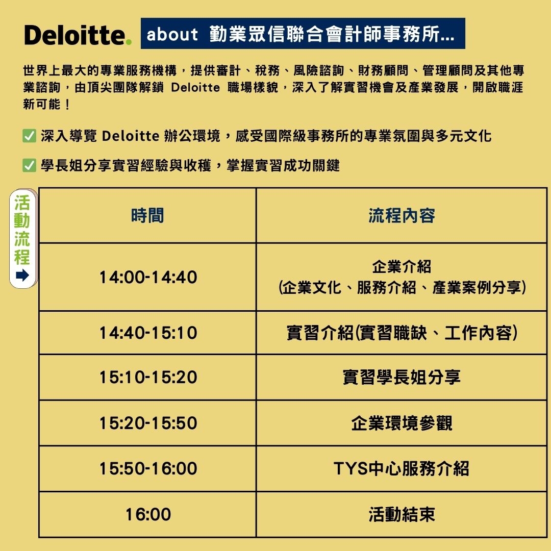 原訂 5 月 27 日舉辦之「勤業眾信企業參訪」因故延期辦理,擇期後將另行公告,並以 Email、簡訊通知已報名者。