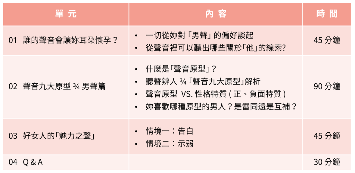 懂說之前要懂聽,在這堂課程裡,周震宇老師將教好女人們,如何從一個人的聲音特質,聽出他現階段的「性格原型」( 天真者、凡夫俗子、英雄、梟雄、智者、丑角、情人、照顧者、王者 ),以及這九大原型的正向、負向特質,以便好女人們在與對方互動的過程中,可以從「聲音」這個元素做延伸,更細膩的去觀察與判斷。
