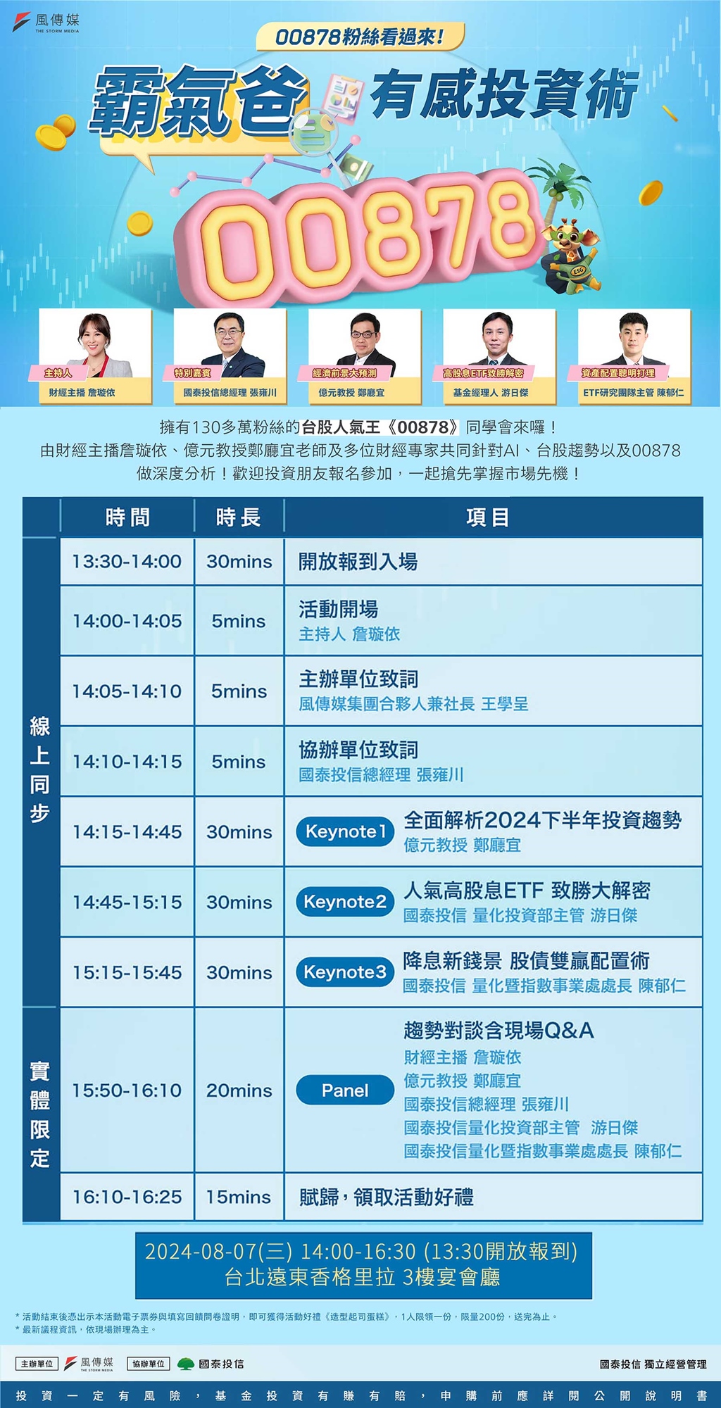 市場上有多檔台股高息ETF供投資人選擇,不同的成分股選股機制,在不同挑選條件下,成果也會有所差異。本場活動將邀請多位財經專家,針對未來AI、台股投資趨勢及人氣王00878做深度分析!