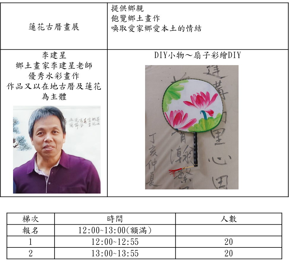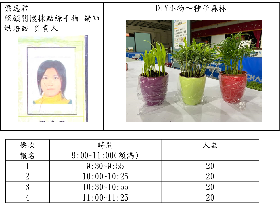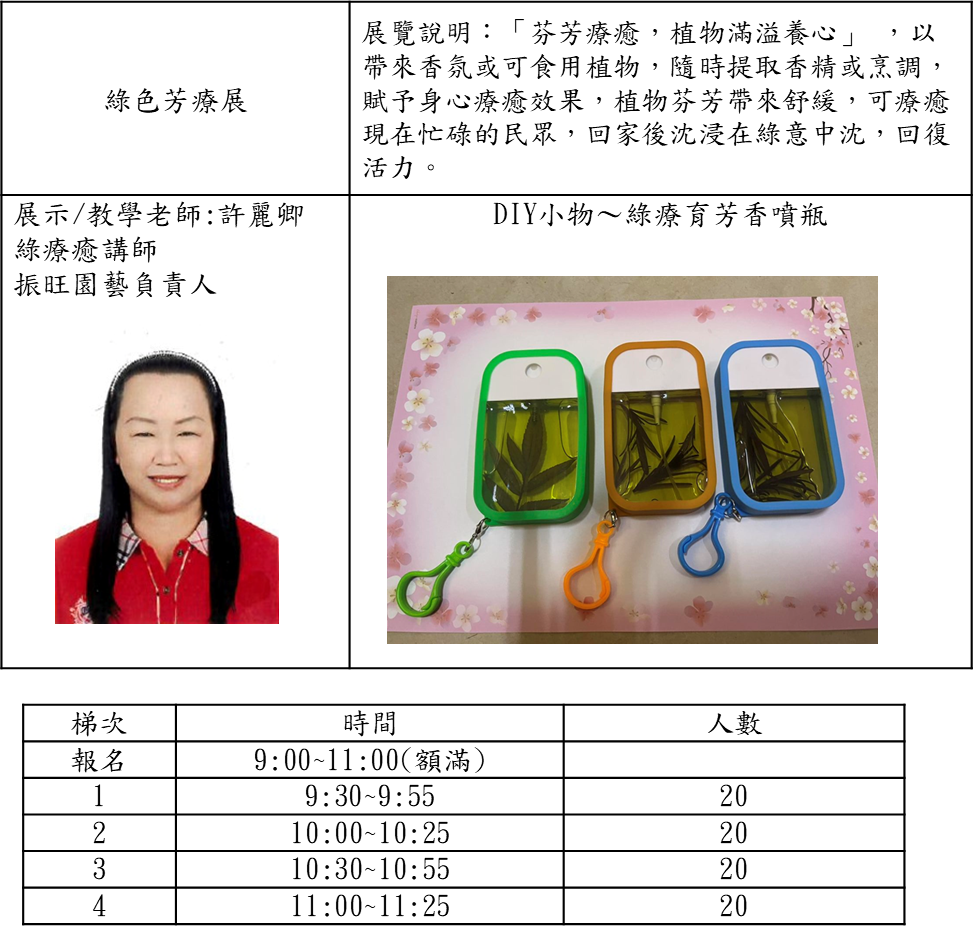 3.網路報名開放每梯次10人,共60人次,網路額滿後,活動現場報名每梯次10人,報名時間請 參閱下列DIY時間表