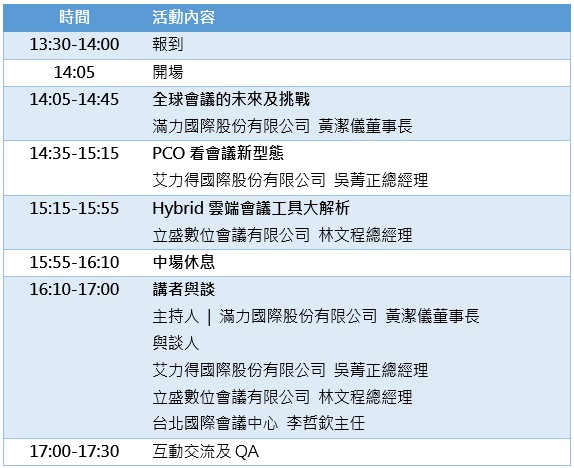 首場會展趨勢課程-會議趨勢及雲端工具大解析,邀請資深PCO業者-滿力公司黃潔儀董事長及艾力得公司吳菁正總經理-分享全球會議趨勢及會議新型態看法;另邀請數位化會議軟硬體服務專家-立盛國際數位會議林文程總經理,前來解析市面常用會議工具,期能提供你會議最新趨勢及最適切的會議解決方案!