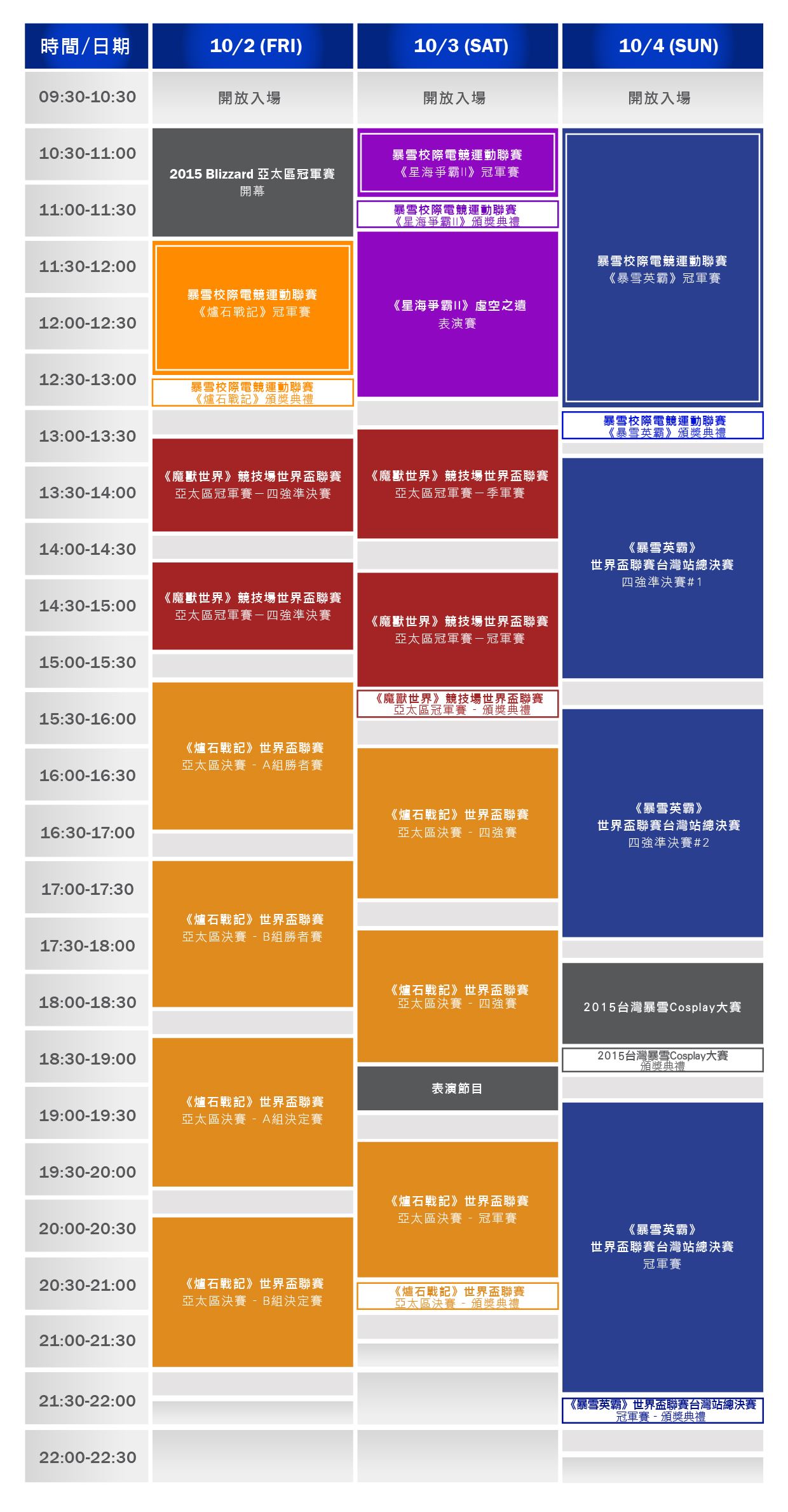活動日期:2015/10/02(五) ~10/04(日),每日活動結束時間,將依賽事實際進行狀況而有改變動。以下結束時間僅供參考。