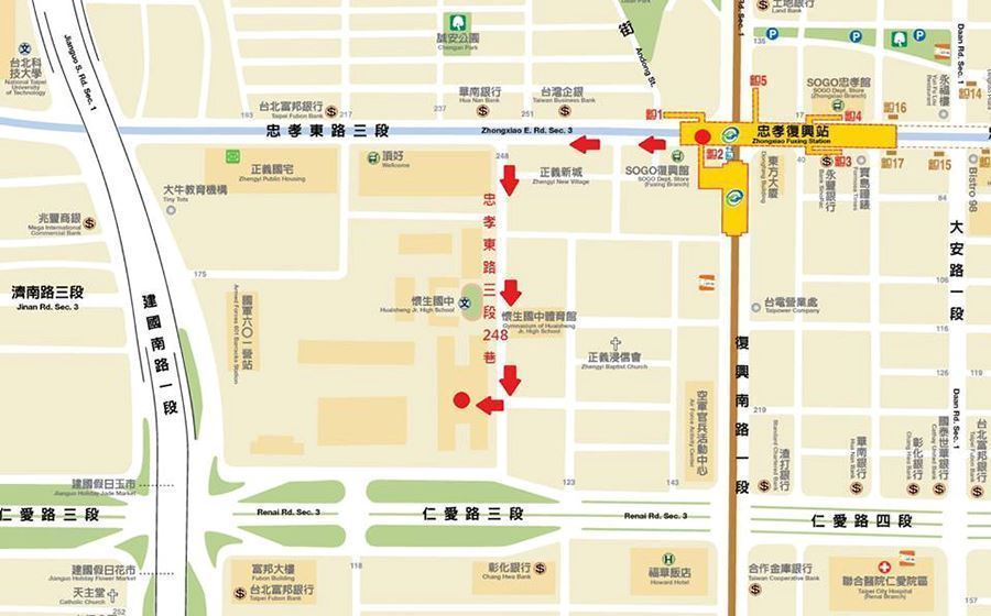 交通指引:請由捷運忠孝復興站2號出口出站,沿著忠孝東路三段直走,再左轉248巷,至接近仁愛路的大門進來。