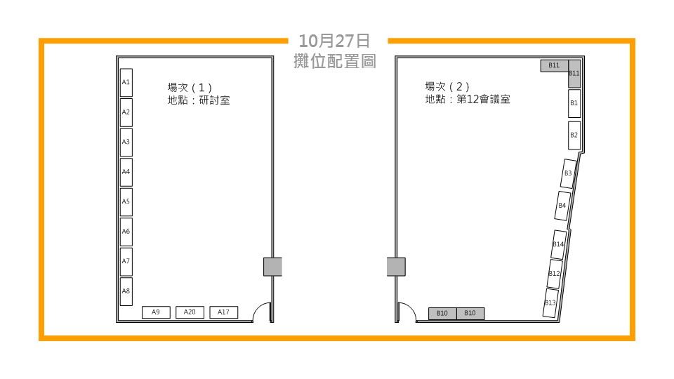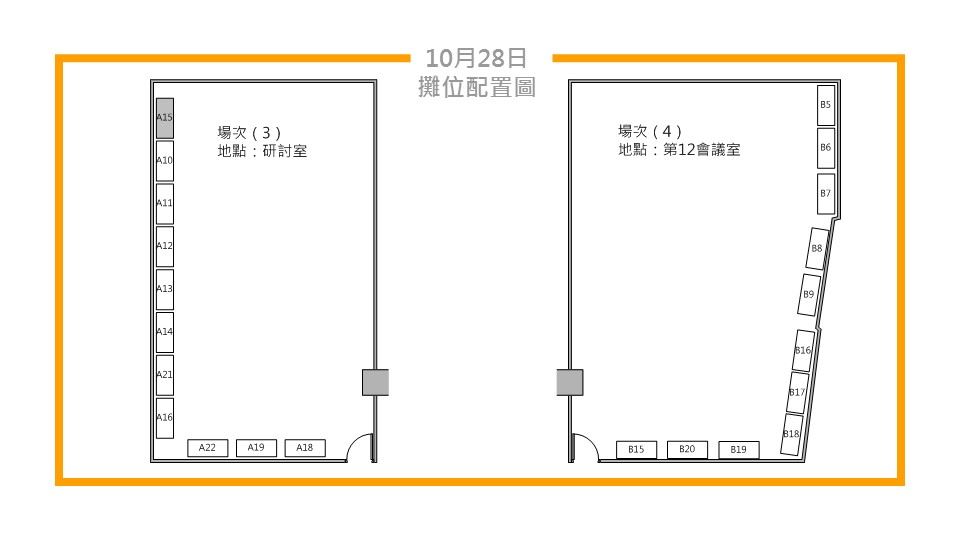 - 會場攤位示意圖(海報將貼於牆面,展品放置於會議桌上),10/27、10/28兩天的攤位配置圖請參考文末【附件A】,因場地有限,所以第一天成果報告的展品早上10:30佈展,17:10撤展,第二天的成果報告的展品早上08:20進場佈展。