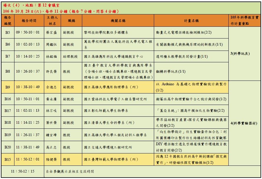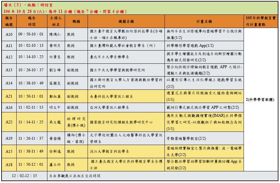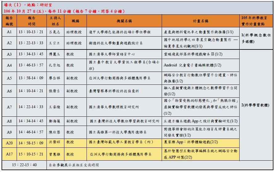 - 本次成果報告採簡報及討論形式,委員將與各場次報告之計畫主持人共同聽取簡報,請各計畫團隊準備投影片上台報告,兩天的報告順序請參考文末【附件B、「105年度科技部科教實作學門計畫成果報告SIG論壇」報告順序】,每組報告時間為7分鐘(包含簡報、影片、實體展示),委員問答時間為4分鐘,共計11分鐘。