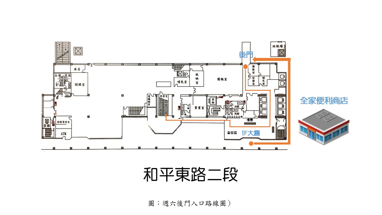 週六科技部大門不會開,請從後門進入。大門右邊跟全家便利商店中間有一條小路,彎進去直走左手邊就會看到後門。請參考下方「週六後門入口路線圖」