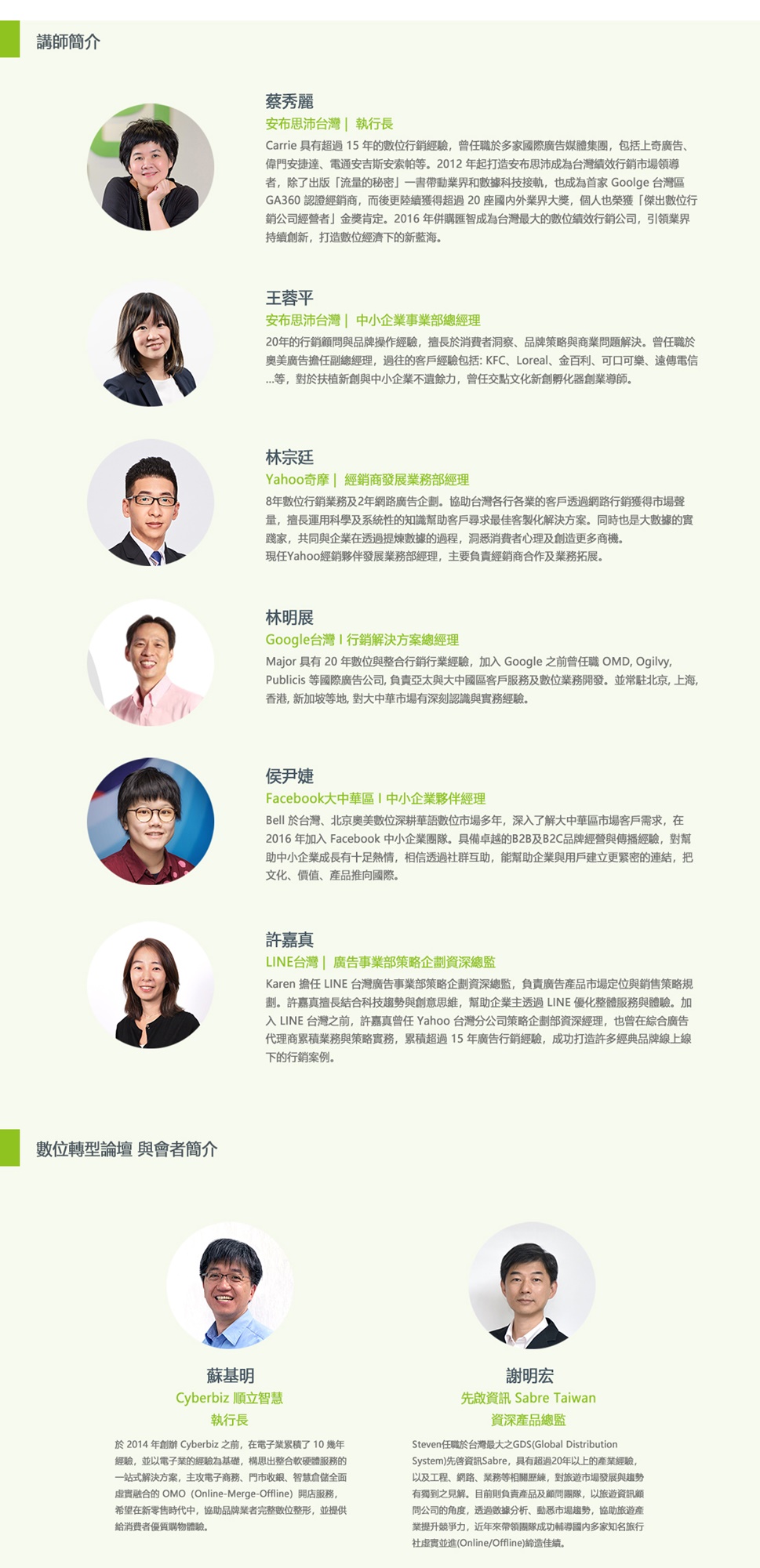 安布思沛台灣每年於6月27聯合國中小企業日,舉辦「#小企業大經濟」數位經濟論壇,今年我們將攜手 Yahoo奇摩、Google、Facebook、LINE 以及旅遊產業先啟資訊 Sabre Taiwan、電商開店平台Cyberbiz,共同探討如何從真實數據出發創造真實效益,掌握行銷致勝關鍵。