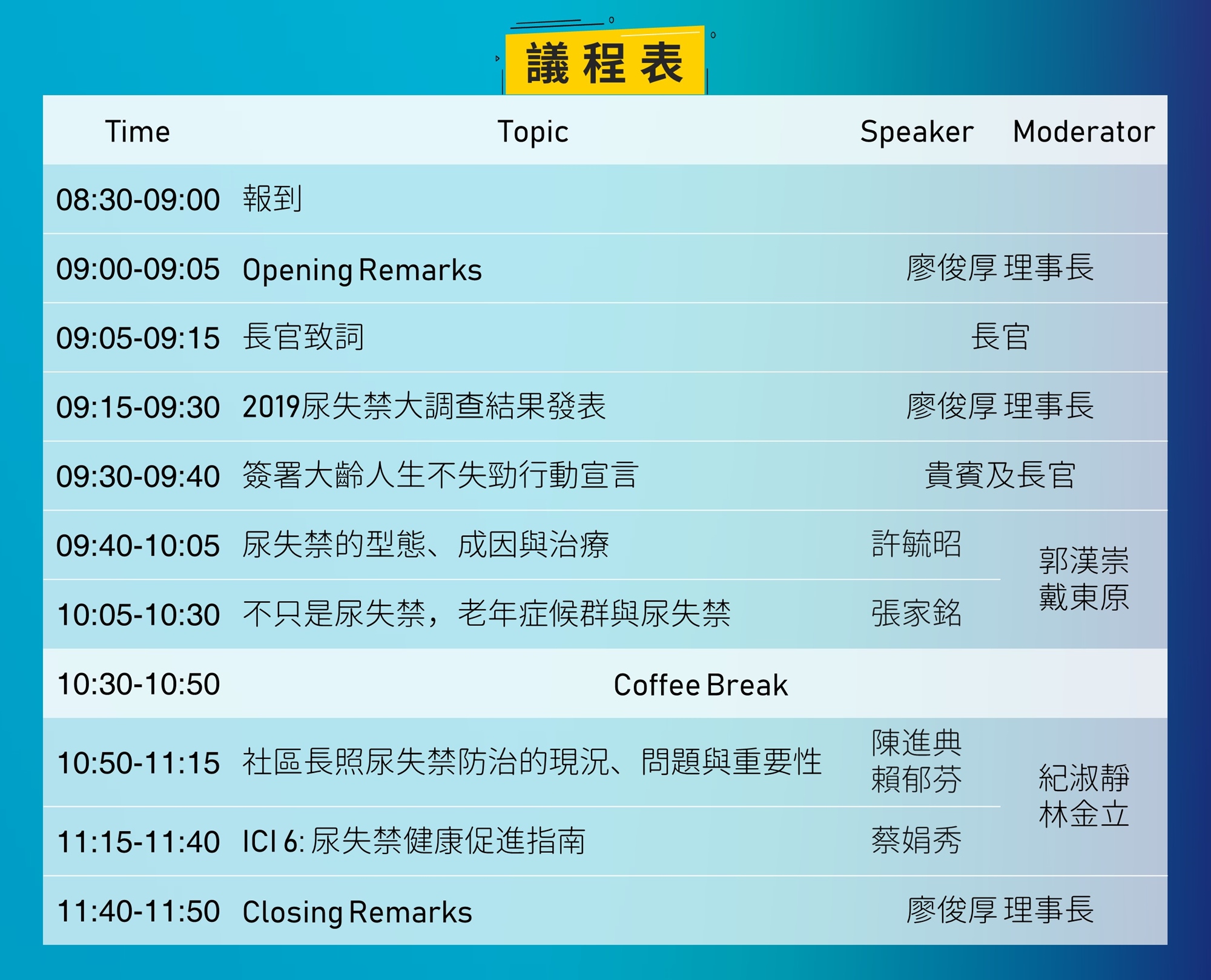 論壇名稱:2019 WCW世界尿失禁週 大齡人生不失勁 中高齡尿失禁防治與健康促進論壇