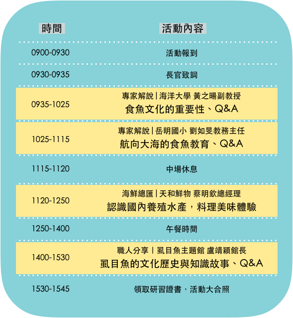 以食魚文化為主題,分享何為食魚教育?為什麼我們要推廣食魚文化?除了培養相關知識,建立國小教職員、營養師正確食魚觀念,並了解永續海洋重要性。同時提供相關教學手冊,加強老師們對食魚教育的認同及教學動機,將相關知識傳遞給國小學童,協助將食魚文化向下紮根。