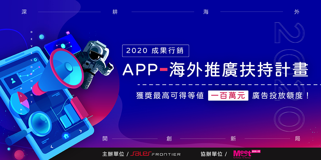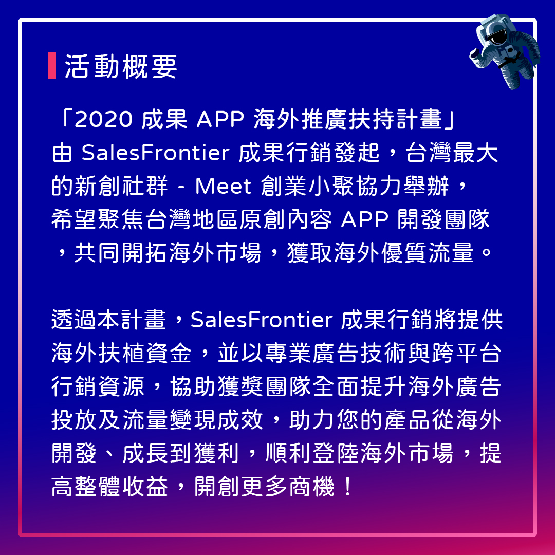 1. 由成果行銷股份有限公司將由『2020成果APP海外推廣扶持計畫』選出三名功能完整且具國際市場潛力之 APP 應用團隊並提供行銷廣告預算與操作團隊協助推廣該團隊產品: