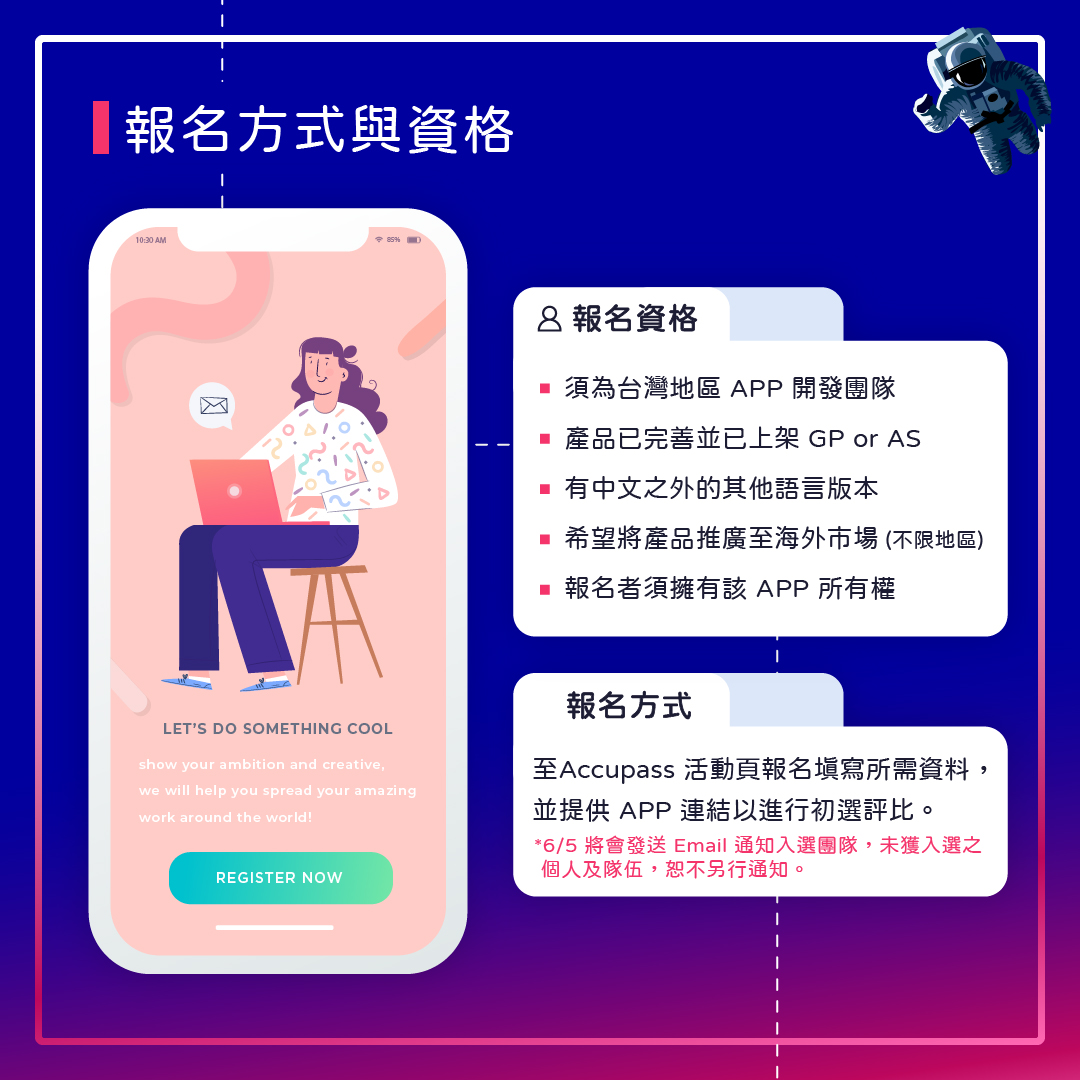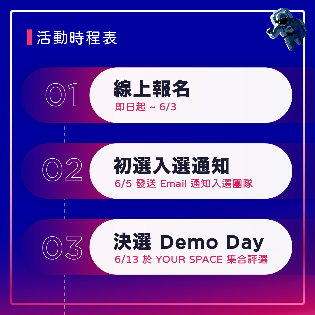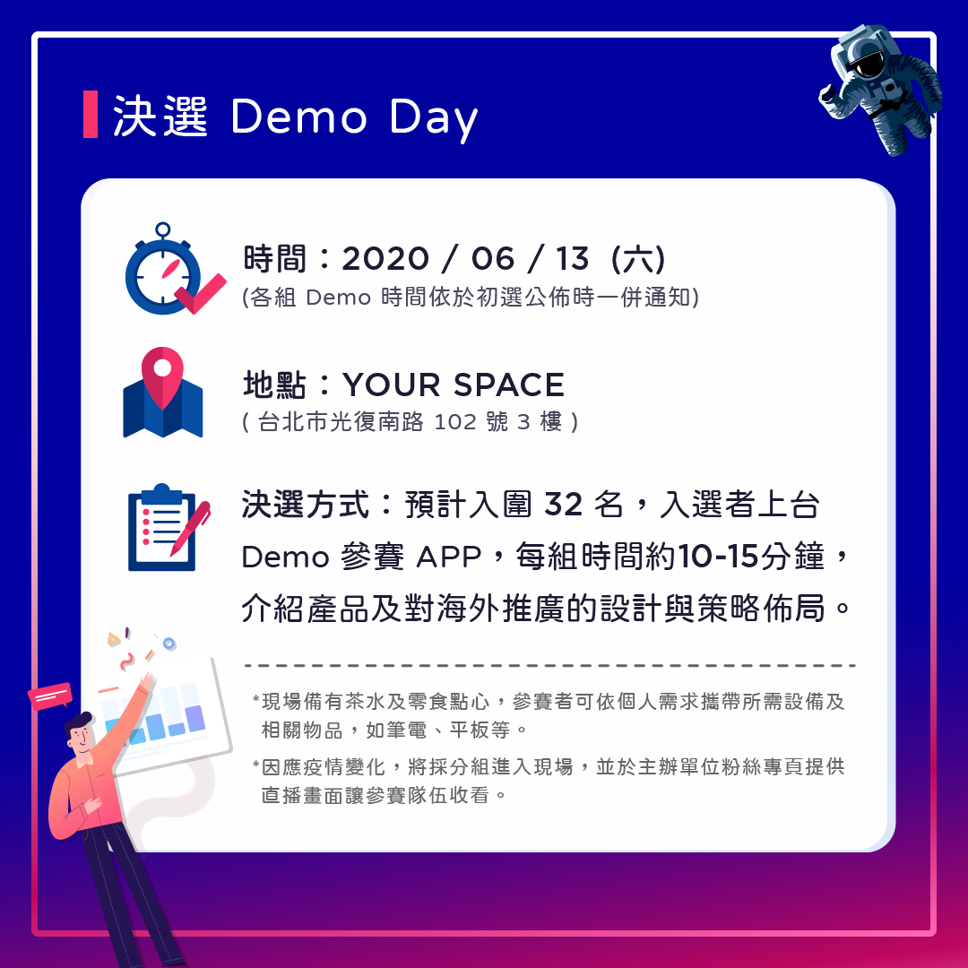 6. 因應疫情狀況,活動當天預計採取分組進場,並會將活動當天各入選者 Demo 內容以直播方式公開呈現。