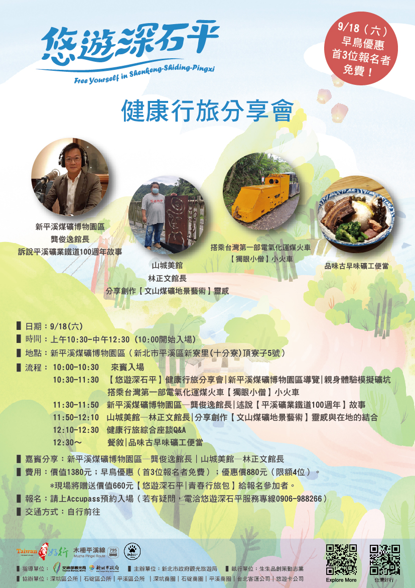 健康行旅分享會,搭乘【台灣好行-木柵平溪線】巴士795,帶你聆聽礦業鐵道百年人文,親身體驗台灣第一部電氣化運煤火車【獨眼小僧】與進入模擬礦坑的樂趣,感受平溪礦工日常。