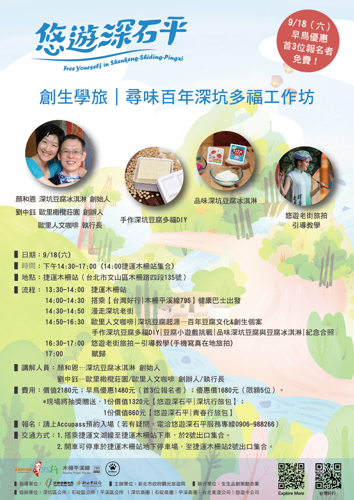 帶你尋訪深坑多福小鎮,聆聽深坑豆腐百年傳奇文化與體驗手作深坑豆腐。等待深坑豆腐烹煮過程,參與豆腐小遊戲挑戰與品味深坑豆腐冰淇淋。豆腐出爐時,盡情品味親自手作的深坑豆腐,絕對別有一番風味。漫走深坑老街,尋覓老街特色美拍地點。