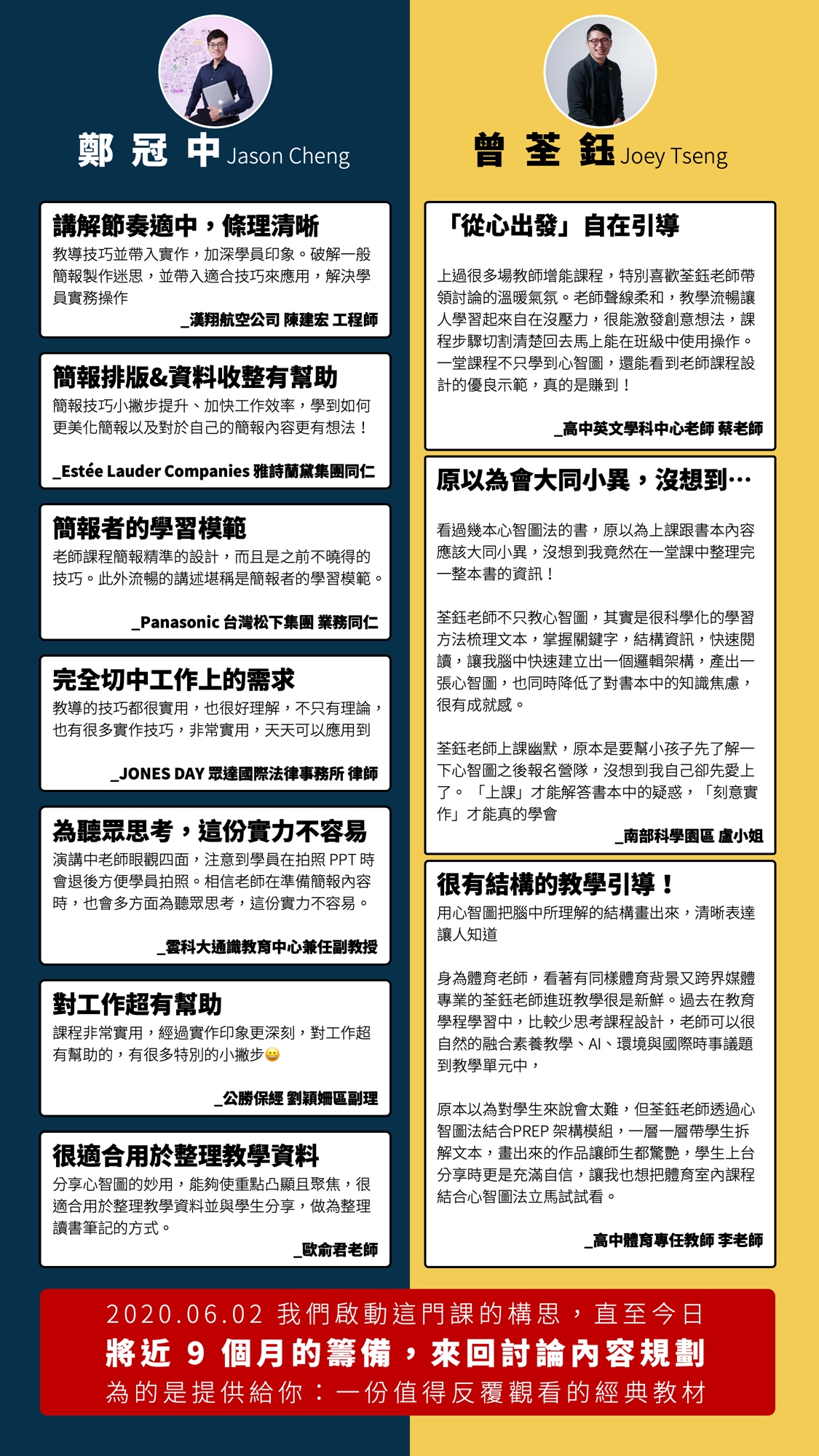Hi 我們是圖解表達力線上課程的雙講師 冠中跟荃鈺,很開心有機會跟各位線下夥伴交流