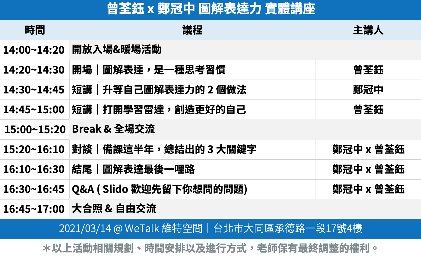 - 適合,當然如果你還在考慮,那就一定要來 3/14 線下講座,3 個小時看到兩位講師,從不同面向拆解為什麼要耗時半年,針對許多學員需求,籌備出這門大課『圖解表達力』