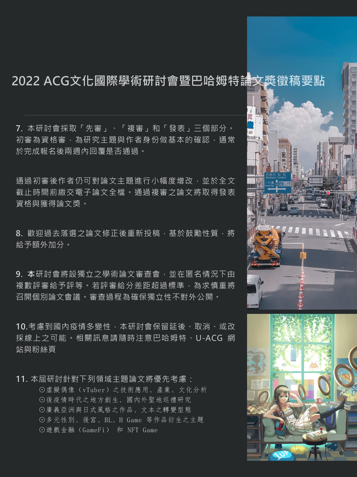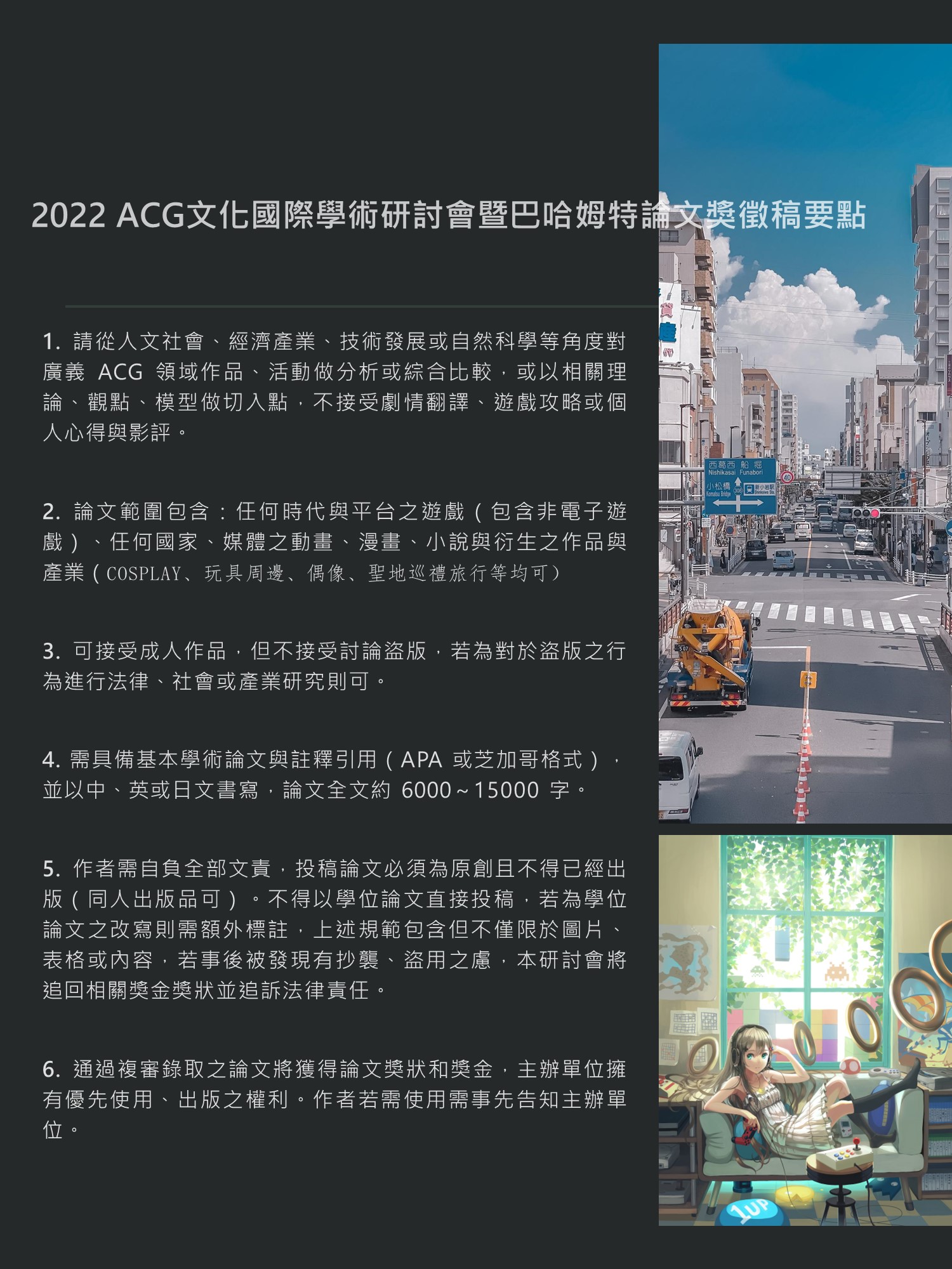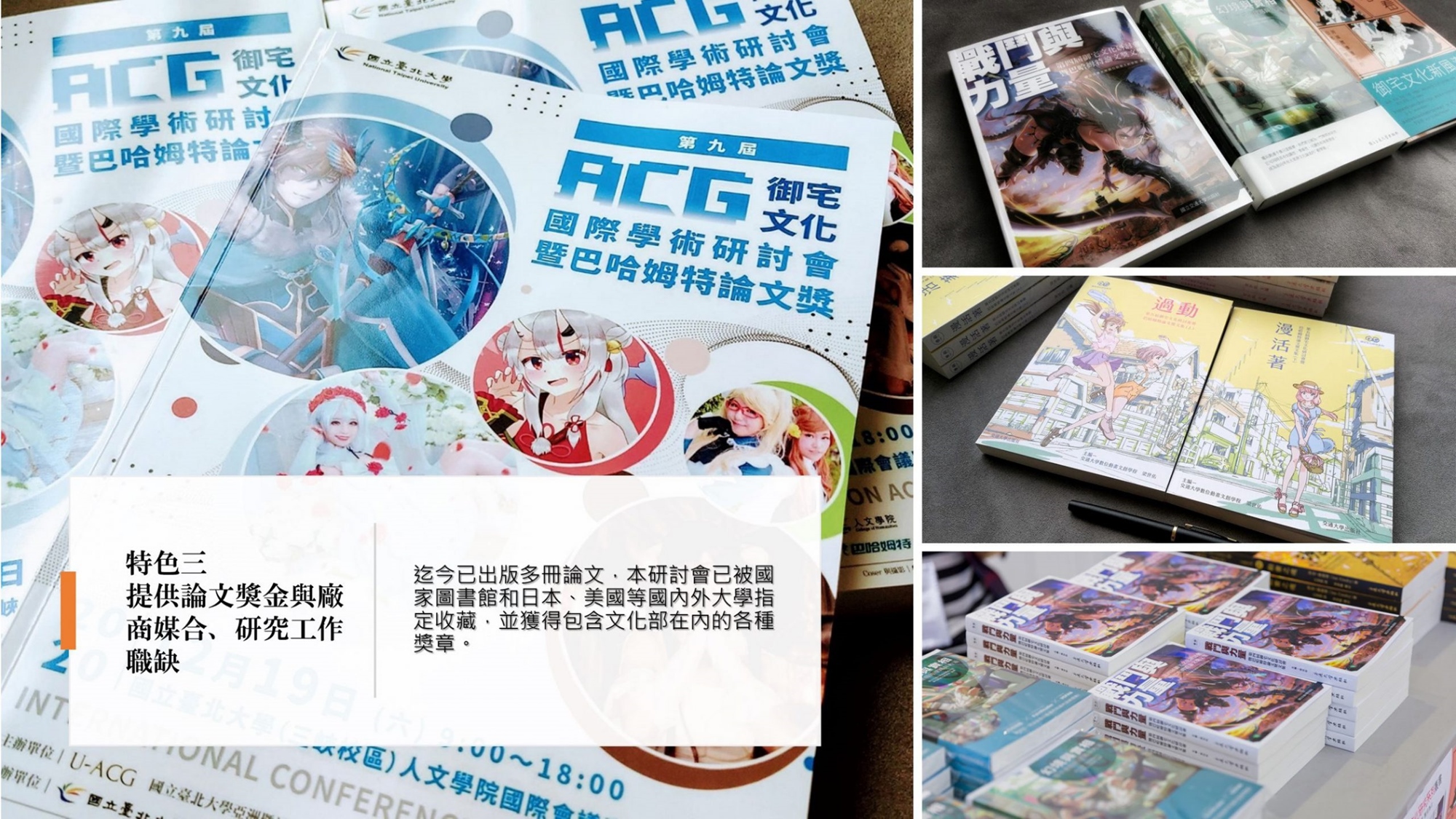 ACG 文化國際學術研討會從 2012 年於國立交通大學數位文創動畫學程創設以來,在主辦人梁世佑老師(RainReader)多位教授的支持與努力之下,已成為國內,乃至於亞洲動漫遊戲娛樂與產業中最重要的研討會。