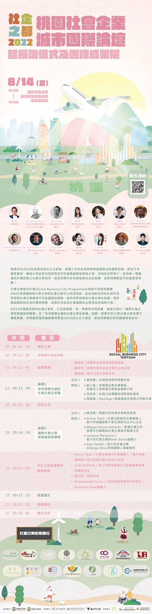桃園市自2018年宣誓成為社企之都後,經歷三年多的考察期與義大利認證單位的實際訪查,終於在今年獲得正式資格,成為全世界第3、亞洲第1個獲得本認證的社企城市,是桃園扶植發展社企生態圈並取得國際認可的重要里程碑。