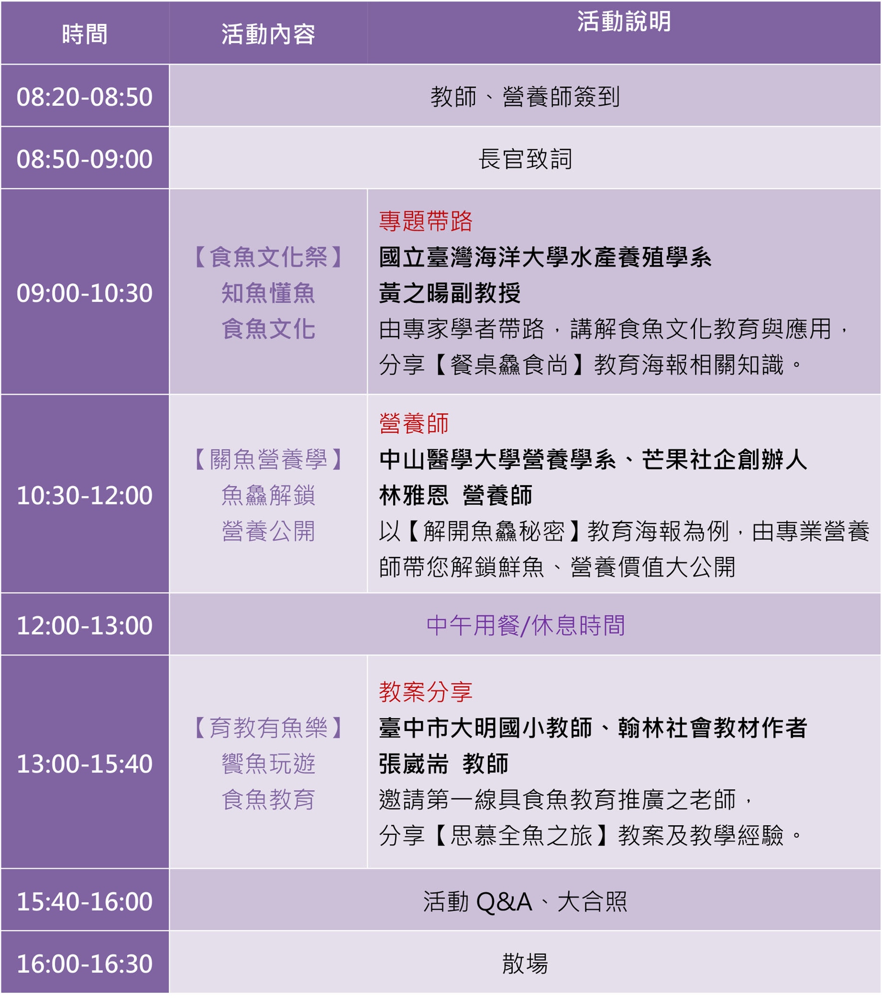 邀請專家學者,以食魚文化為主題,分析、分享相關的漁業知識,培養國小教職員、營養師正確食魚觀念,了解永續海洋重要性,強化教師對於國小學童食魚教育的背景知識。
