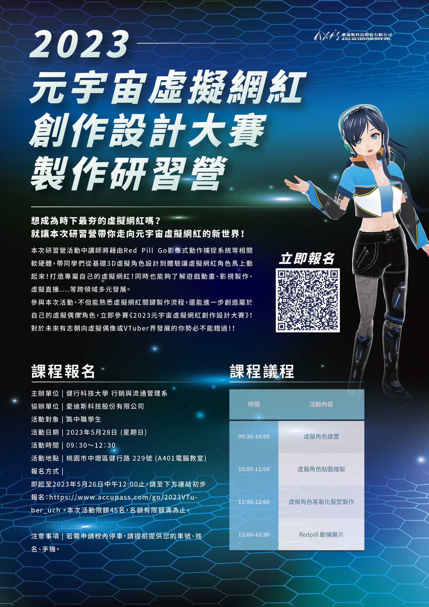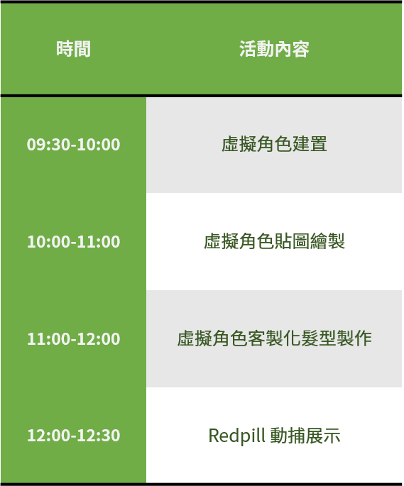 本次研習營活動中講師將藉由Red Pill Go影像式動作捕捉系統等相關軟硬體,帶同學們從基礎3D虛擬角色設計到體驗讓虛擬網紅角色馬上動起來!打造專屬自己的虛擬網紅!同時也能夠了解遊戲動畫、影視製作、虛擬直播....等跨領域多元發展。