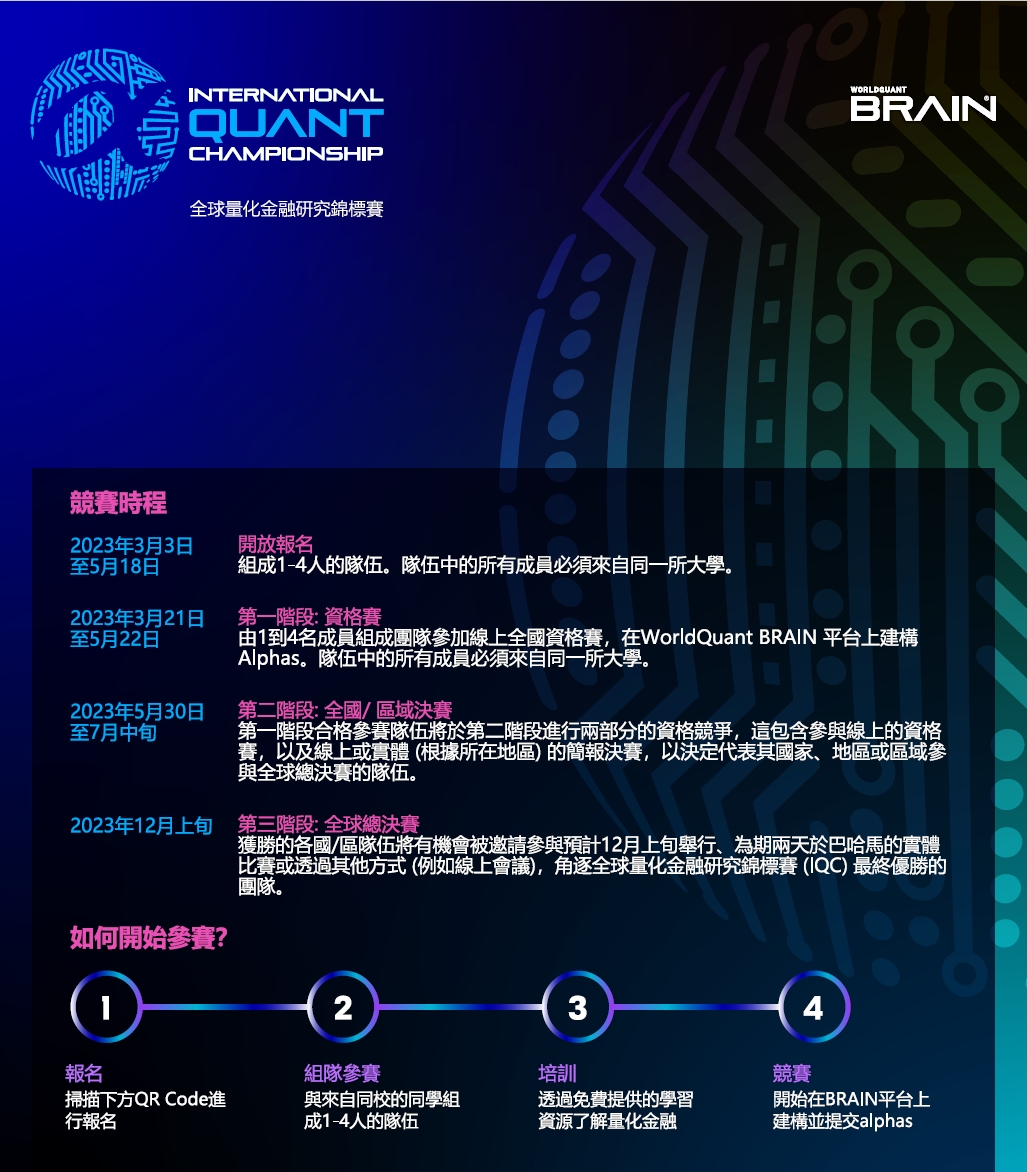 International Quant Championship是一個分為三階段、以團隊為基礎的競賽,將於2023年3月至12月間舉行。參賽者將在WorldQuant BRAIN的線上模擬回測平台上建構alphas*,利用市場歷史資料和我們事先定義好的operators (運算子) 來模擬股票持倉,以此方式累積分數。