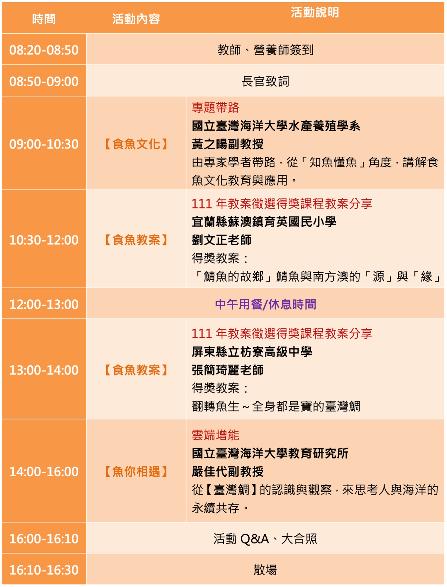 課程規劃除了學者專家帶路之外,另邀請第一線的教育工作者及111年食魚教案徵選得獎之教案,進行課程安排及教案分享。