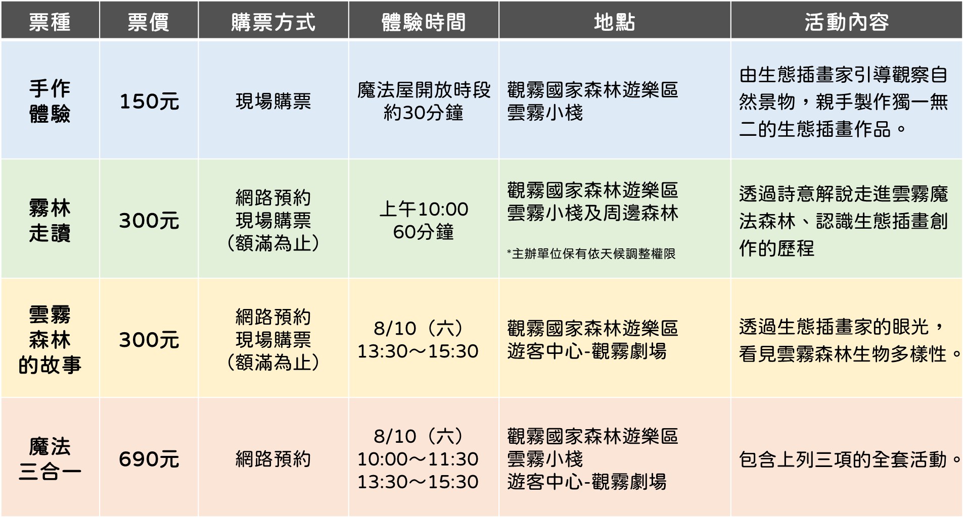 「雲霧魔法屋」將於113年8月3日(六)至11日(日)在觀霧國家森林遊樂區開張,林業及自然保育署新竹分署特別邀請生態插畫家進駐觀霧森林。為期九天的駐點活動中,您可以造訪雲霧魔法屋,選擇參加: