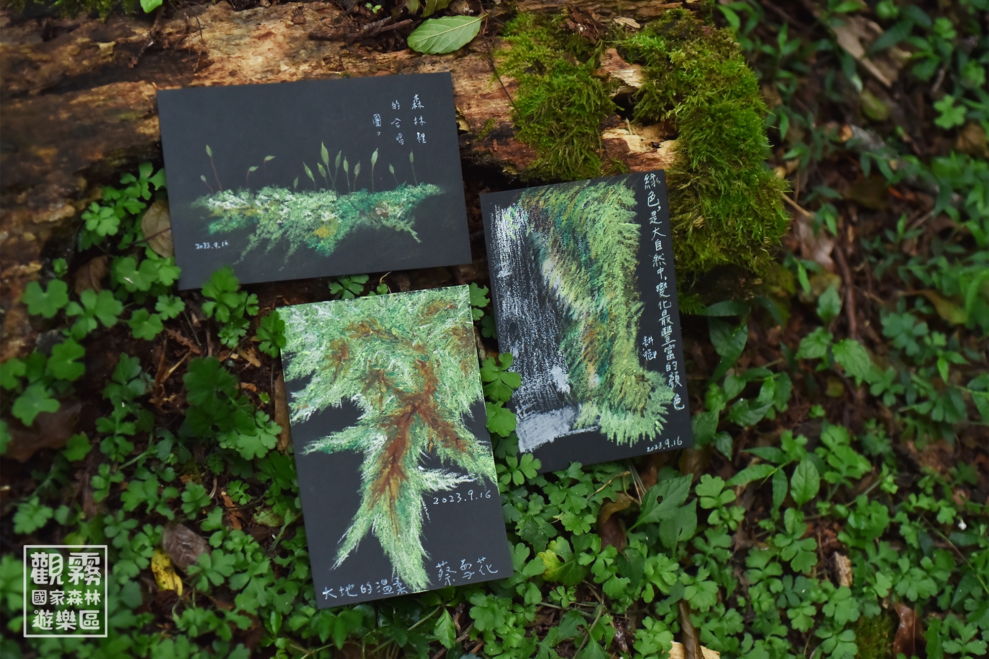 ▲來吧!揮動魔杖創造一幅獨一無二的苔蘚插畫。(圖為2023年觀霧主題活動「霧林手作」參與者作品,森之形自然教育團隊提供;陳柏璋攝影)