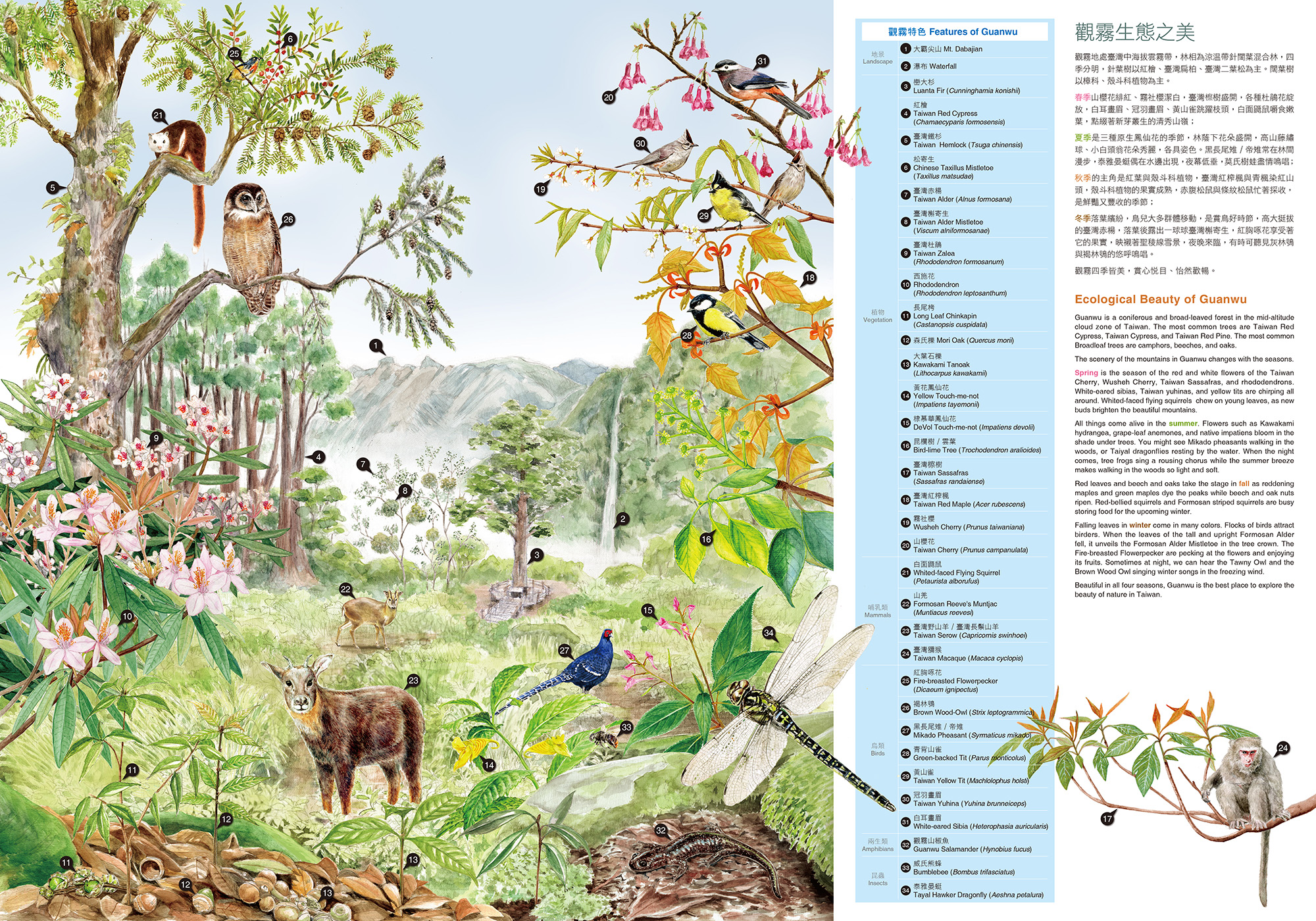 ▲翻開觀霧的地圖摺頁,背面精美的「觀霧全景圖」是一大收藏亮點!這張圖的原型出現在2021年觀霧雲霧小棧《來自森林的恩賜》主題展,由本次主題活動的駐點藝術家--生態插畫與環境教育工作者 黃瀚嶢 ,與 插畫家王錦堯合作呈現觀霧地區不同尺度的生態圖像。
