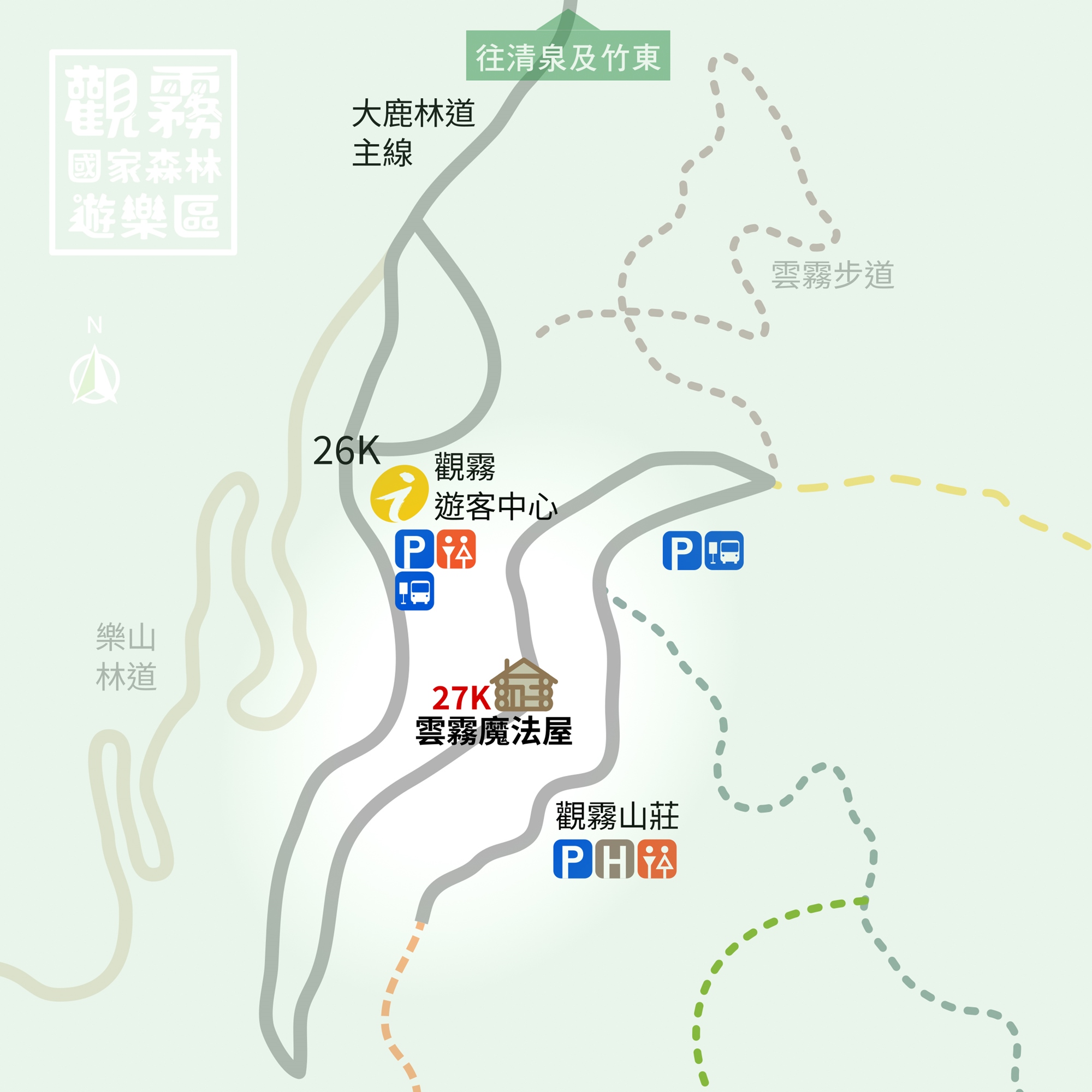 - 臺灣好行觀霧線: 高鐵新竹站發車→遊客中心。到站後繼續沿著大鹿林道步行15分鐘抵達「雲霧魔法屋」(雲霧小棧)。