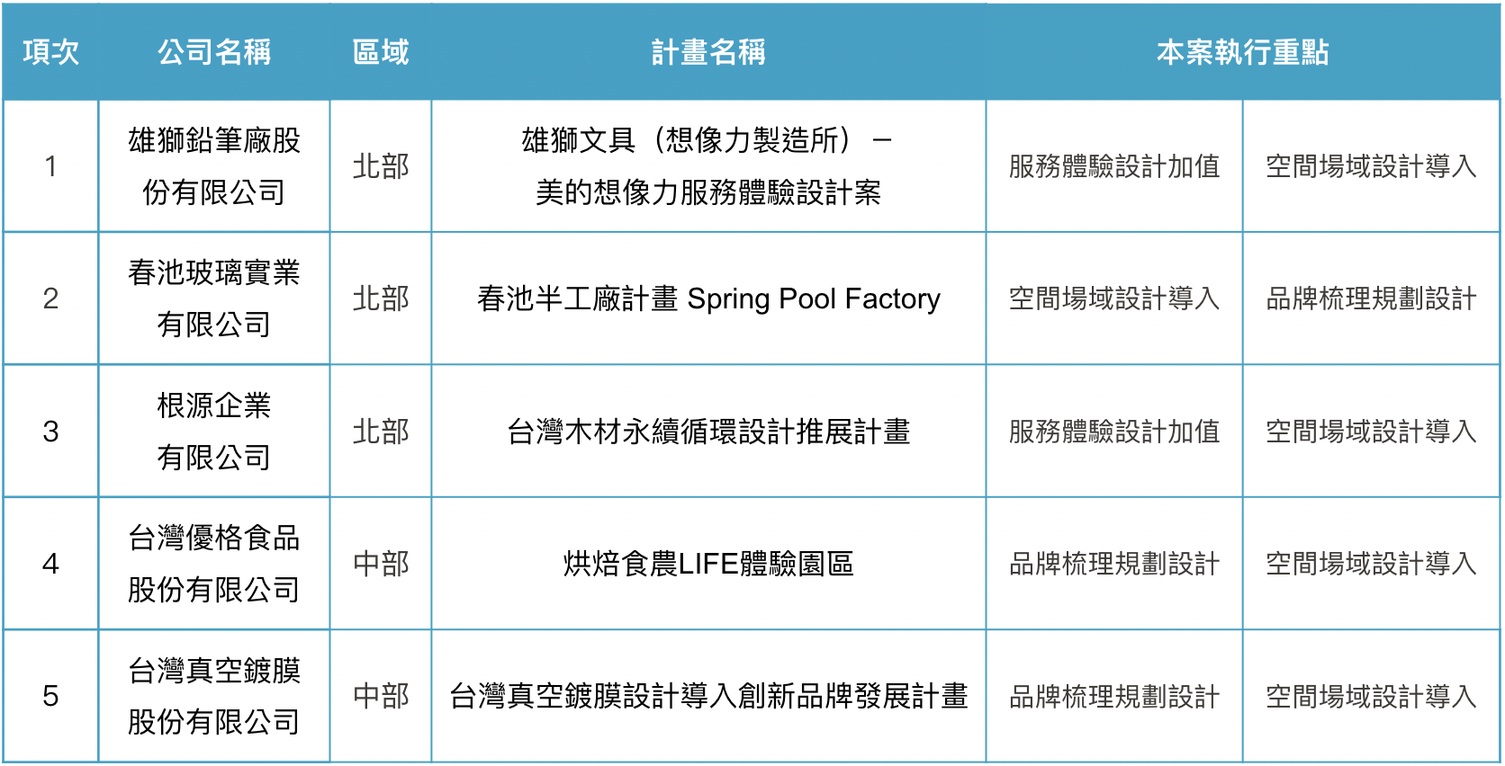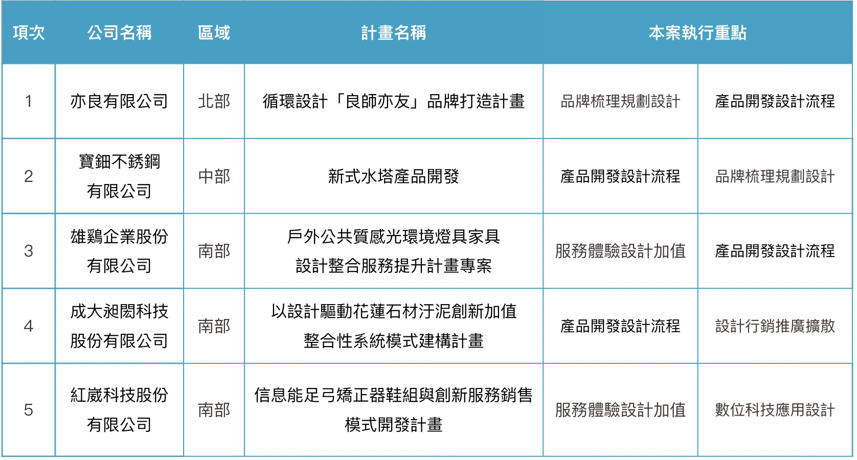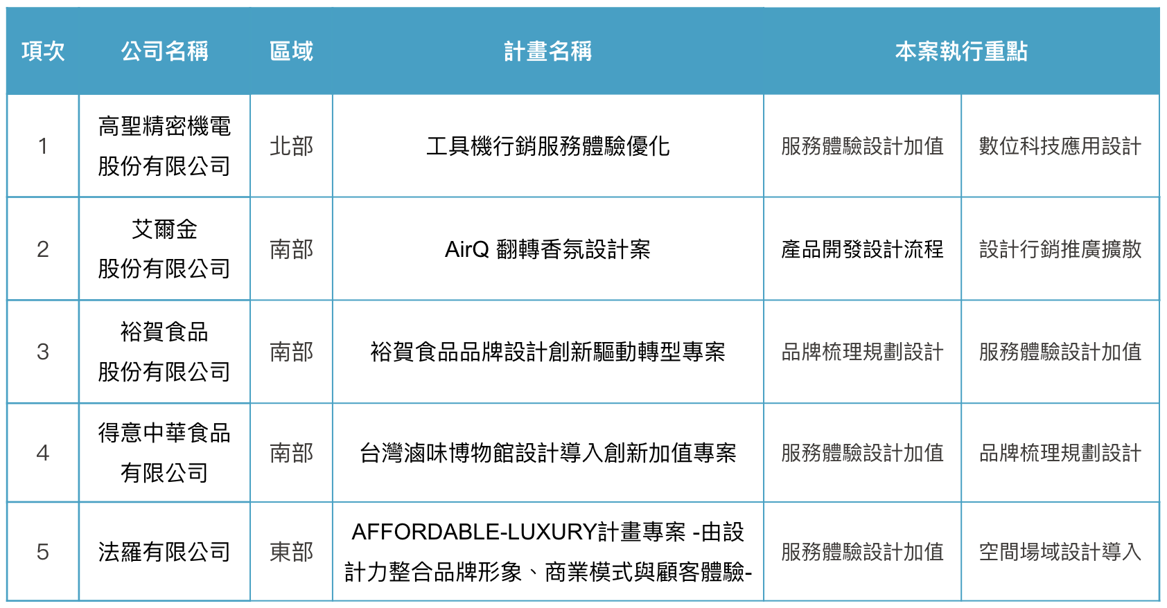 近期,成功遴選出15家製造業廠商,並據多元的提案內容,將設計需求整合為「設計串連服務場域」、「設計形塑企業價值」、「設計建構商業模式」三場次。