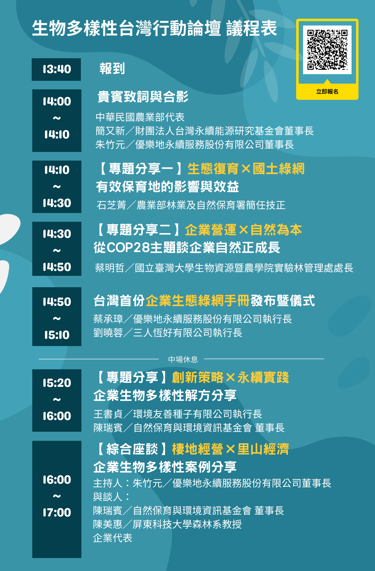 論壇下半場將邀請環境友善種子與遠雄人壽共同分享企業生物多樣性案例與解方,爾後綜合座談時間將由優樂地永續董事長朱竹元主持,並邀請企業永續發展協會秘書長莫冬立、臺灣環境資訊基金會董事長陳瑞賓、屏東科技大學森林系教授陳美惠,以及優秀企業代表共同探討企業與民間組織如何共同守護生物多樣性。