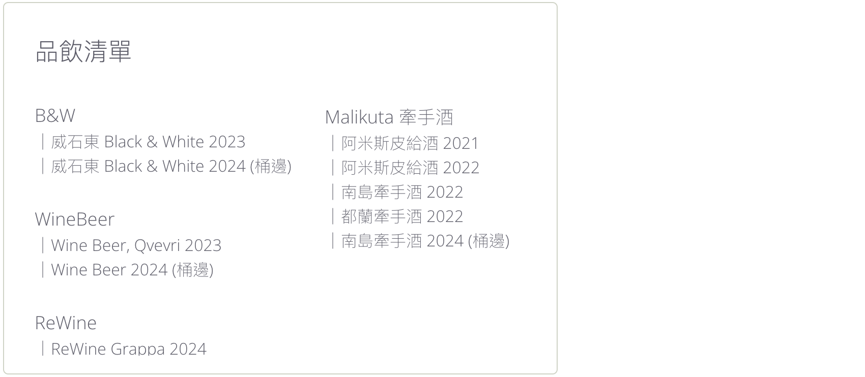 釀酒師|Winemakers:Helio Godefroy, Antoine Jonquères, Henri Jonquères, Domaine Kaban, France|Gabriele Dolfi, Inserrata Organic Farm, Italy|Vivian Yang, Weightstone, Taiwan|Marcie Chan, Malikuda Austronesian & BN WineBeer, Taiwan|Liliw, Malikuda Atolan, Taiwan|Wilma Ku, ReWine, Taiwan.