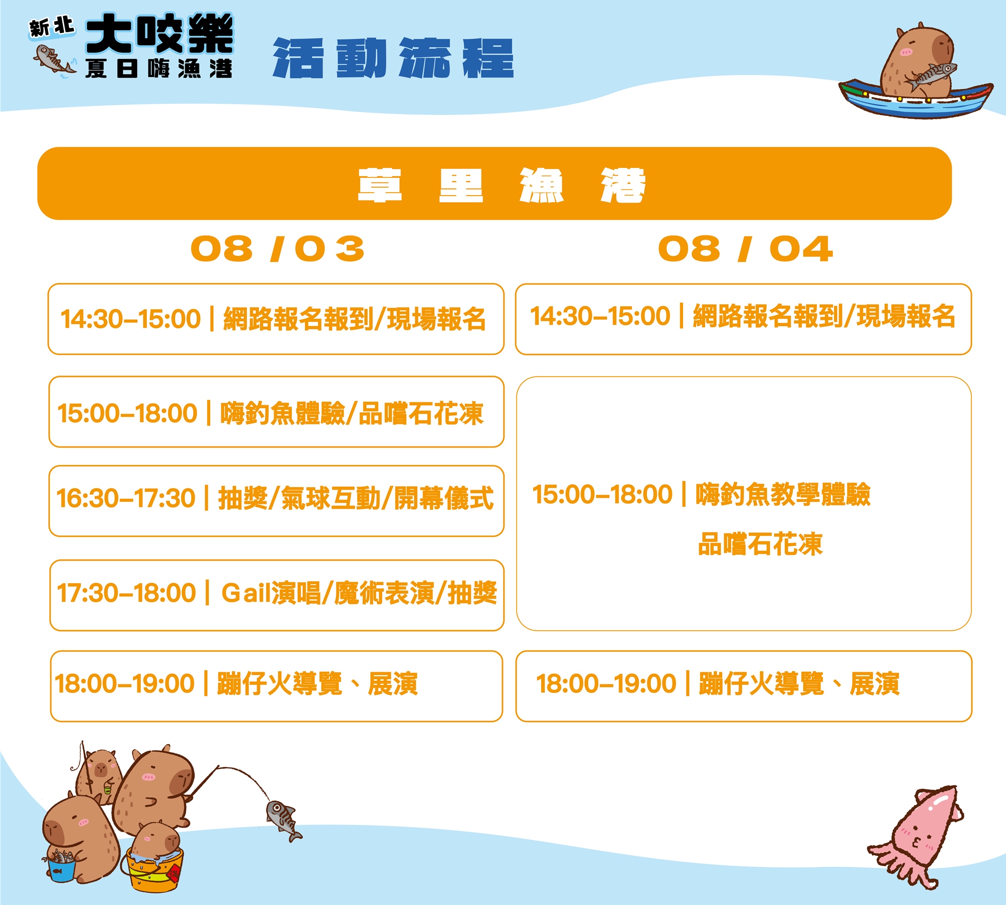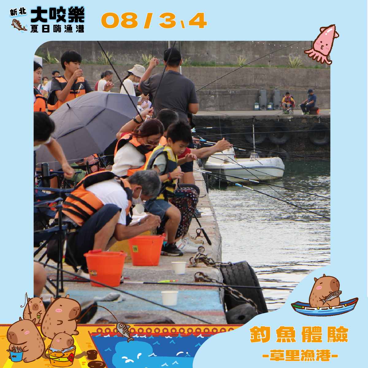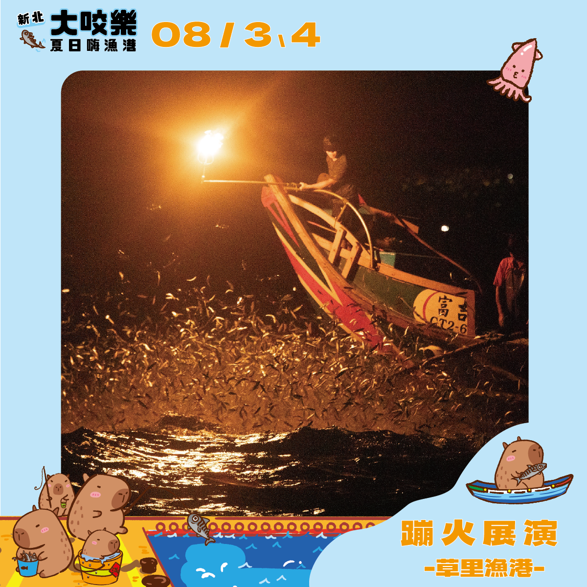 新北大咬樂!夏日嗨漁港!在草里漁港開跑啦,為期兩天,邀請大家8/3、8/4來草里漁港吹海風、吃美食,現場將有釣魚教練教導如何釣魚,開幕當天還有藝人演唱及表演團體互動,更有抽獎活動,傍晚更有世界唯一的磺火漁法-蹦仔火震撼展演,來一場難忘的夏日之旅!