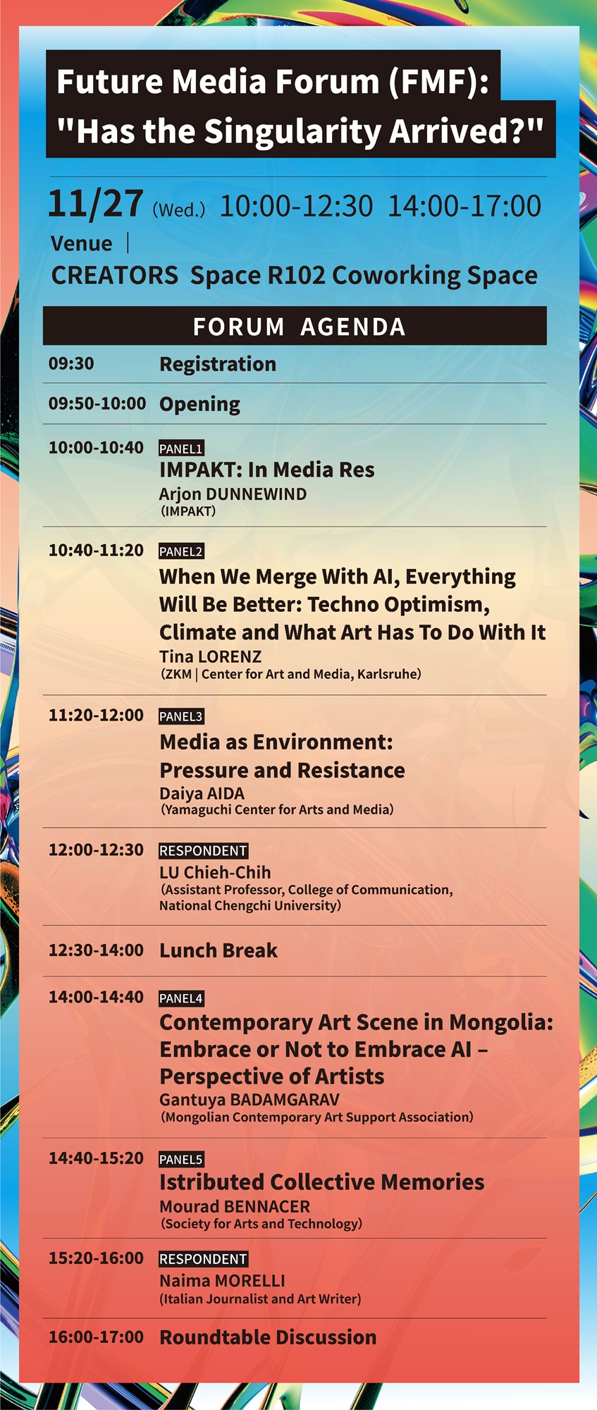本屆的未來媒體藝術節展覽分為四個章節來呈現AI發展至今所帶來的多重議題挑戰,展期間同步舉辦的未來媒體論壇(FMF)深入探討AI如何改變藝術的創作生態系,以及當下各藝術機構、策展人、創作者及社會大眾如何應對這些轉變。論壇議題將涵蓋AI對藝術創作流程的影響,以及它對視覺文化的革新作用。AI生成藝術帶來的美學轉變與倫理議題等。此次論壇邀請了全球的科技藝術機構、藝術節的專家代表共同參與,通過多角度的對話與辯論,將深入探索AI在當代藝術和人類文化中所扮演的角色。