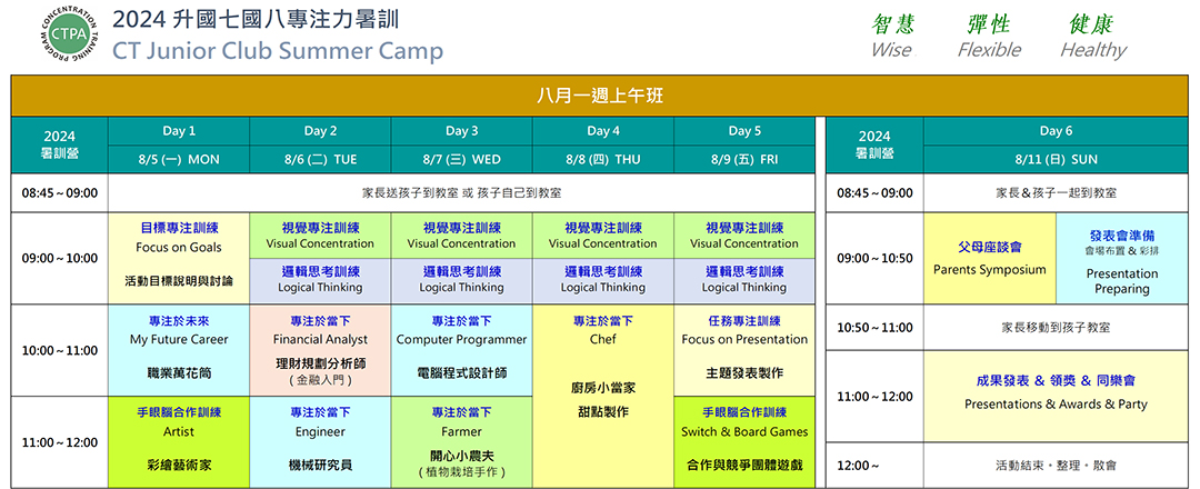 *八月6天上午班:第一到五天 8/5(一)~8/9(五)、第六天8/11(日)。9:00~12:00。