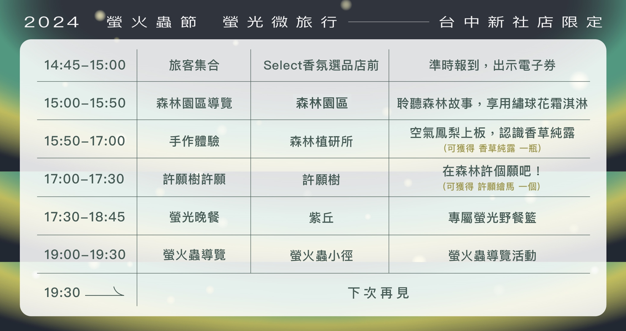 ✨活動時間 | 2024.04.19(五)-05.05(日)15:00-19:30(視螢火蟲生態及氣候狀況而機動調整活動日期,4/22、4/23暫不開放報名)