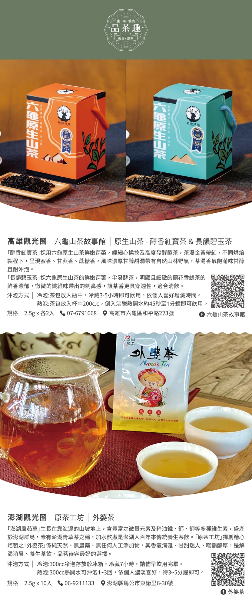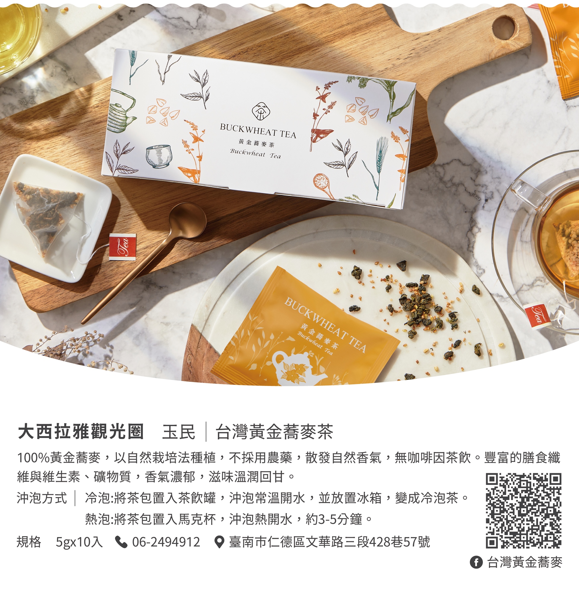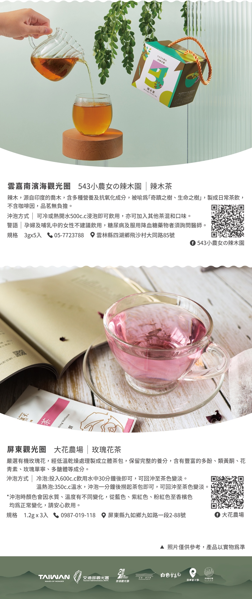 - 產品特色: 精選南台灣原生山茶、玫瑰花茶、外婆茶、辣木茶、蕎麥茶等五款南部觀光圈特色茶,搭配點心、零嘴,讓您在家也能享受悠閒的下午茶時光。