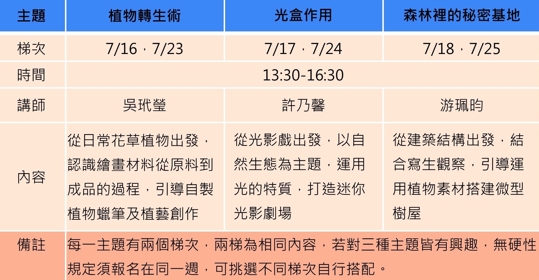 活動內容│分別有「植物轉生術」、「光盒作用」、「森林裡的秘密基地」主題,採每種主題獨立報名。