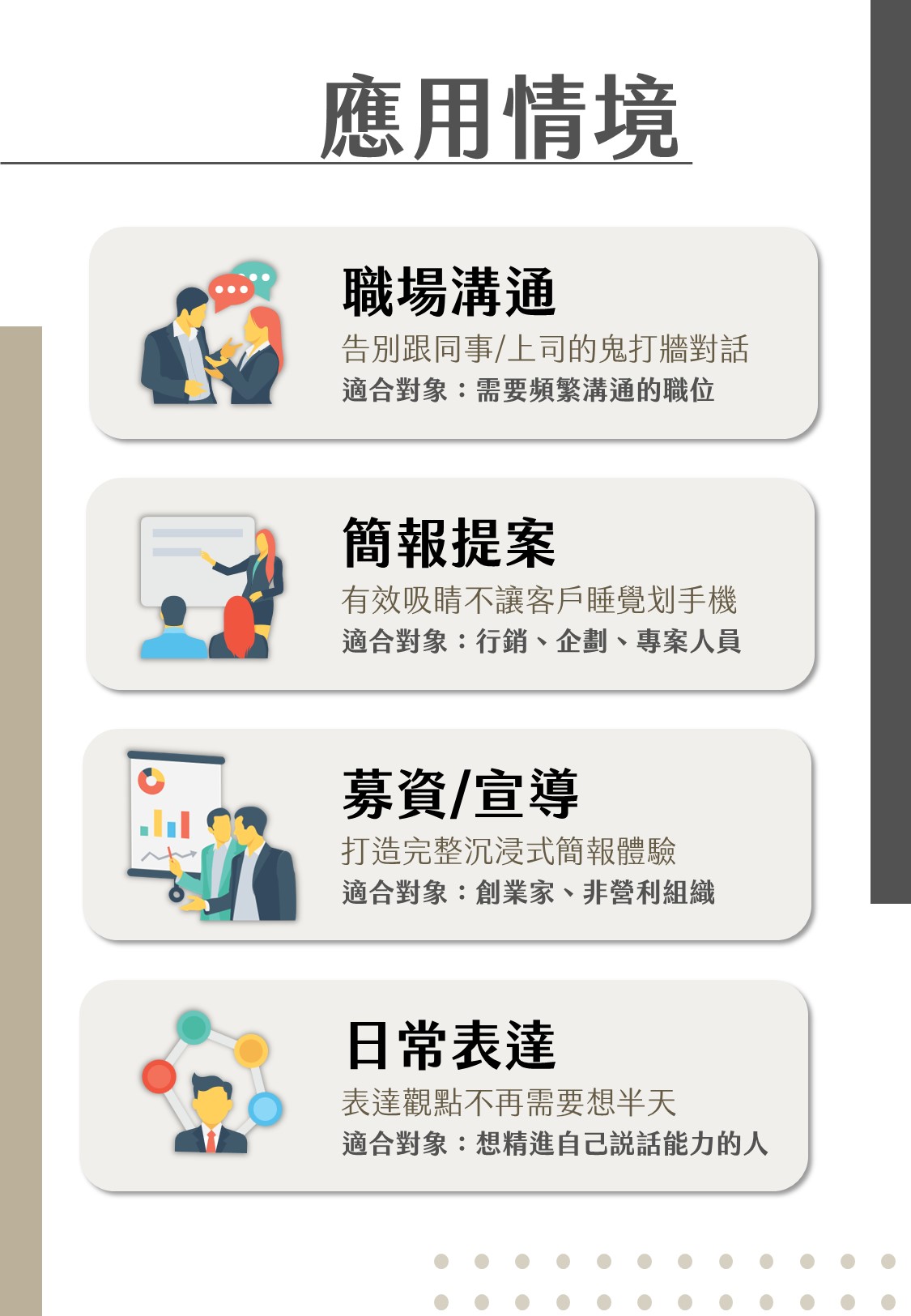 A3:我相信大部分溝通原則都是一樣的,若您有所疑慮可以在報名表中提出相關自身的領域與所碰到的問題。