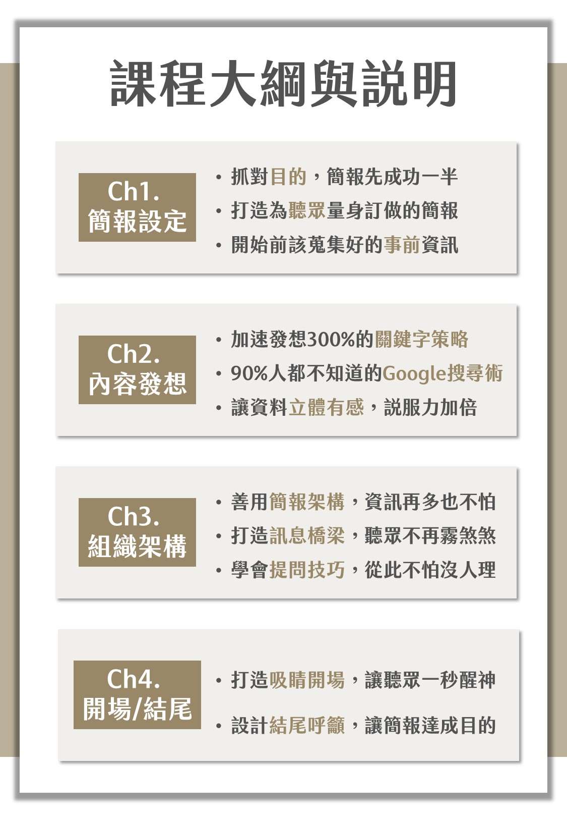 這堂課我們將讓簡報回歸到更根本的內容邏輯,無須精美的PPT設計、甚至不需要任何投影片輔助,你也能透過「精準的內容策略」與「易懂的邏輯架構」,達到有條有理的表達,讓你的聽眾點頭如搗蒜!