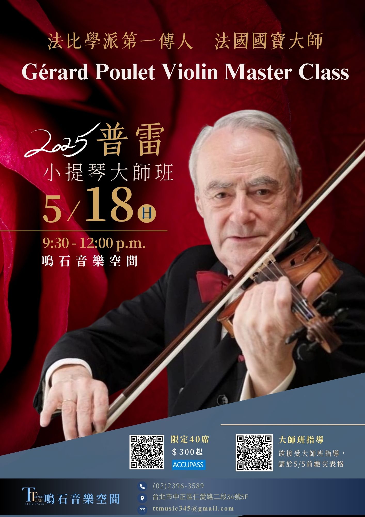 現年87歲的法國國寶小提琴家吉哈德‧普雷(Gérard Poulet),為法國巴黎國立音樂院名譽教授,曾任教於東京藝術大學,現為昭和音樂大學教授。普雷教授自小即展現不凡的演奏能力,11歲考進巴黎音樂學院,18歲即獲得帕格尼尼小提琴大賽首獎,並因其精湛的演奏能力而獲得授權使用帕格尼尼名琴「加農炮」(Guarneri del Gesu)公開演出。現今享譽樂壇的雷諾.卡普松(Renaud Capuçon) 小提琴名家即為他的得意門生。
