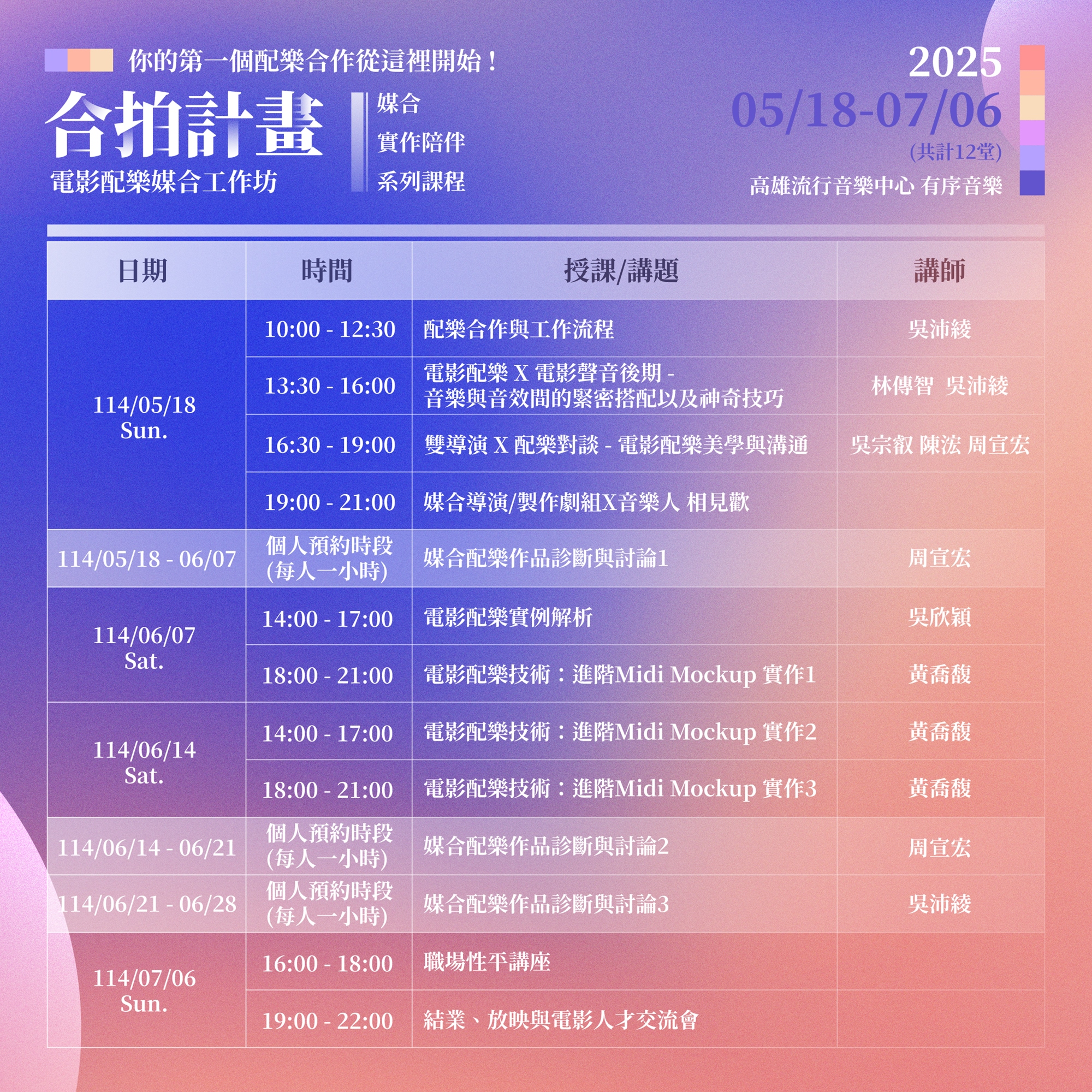 ※ 合拍計劃全程適用:報名審核至 5/10 23:59 止,先到先審(三日內完成審核),5/11 起為媒合階段,不再接受全程報名, 審核過後將再寄發繳費連結。