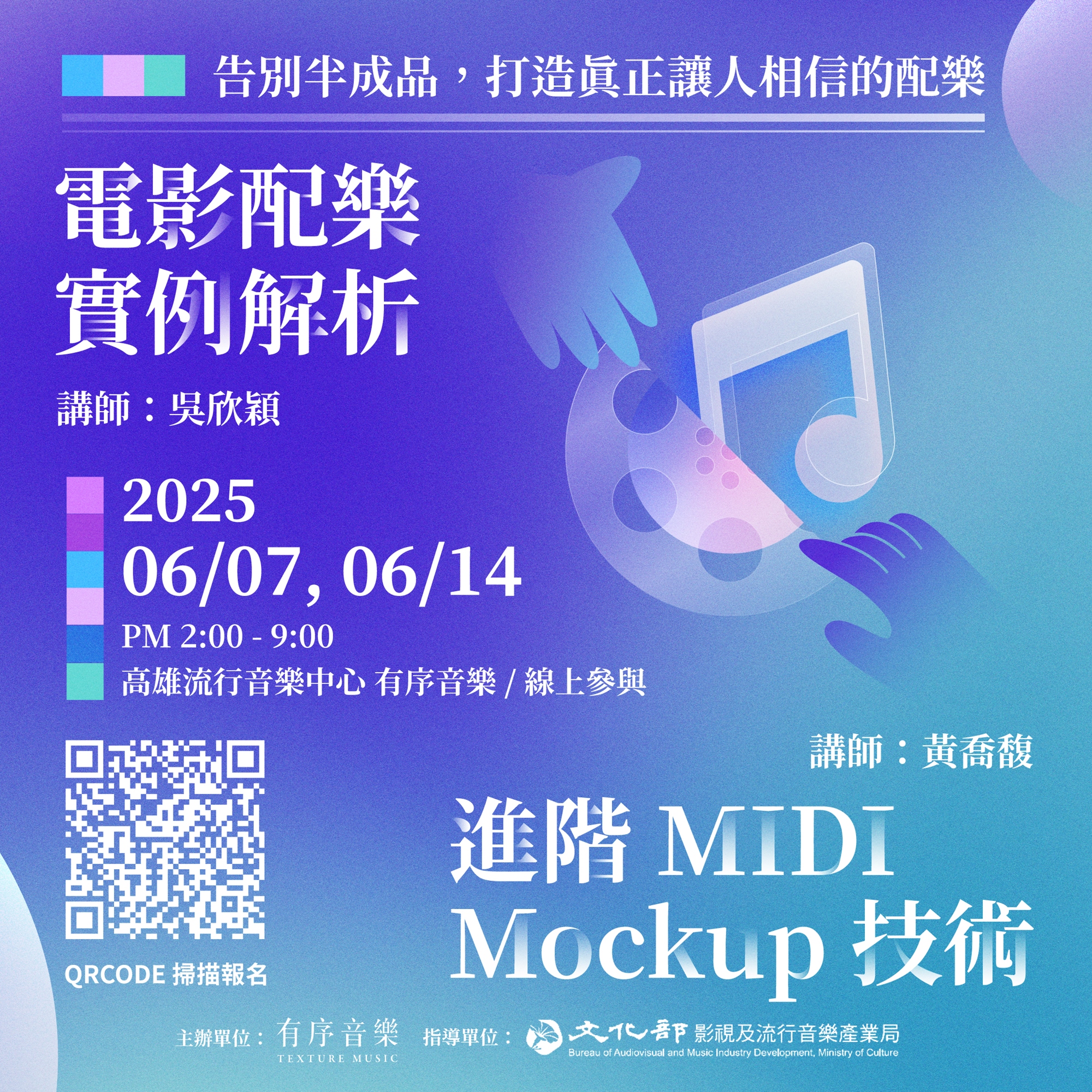 涵蓋配樂合作流程、導演與配樂的溝通美學、音樂與音效的緊密搭配、進階MIDI Mockup實作等全方位扎實必備能力進修內容。