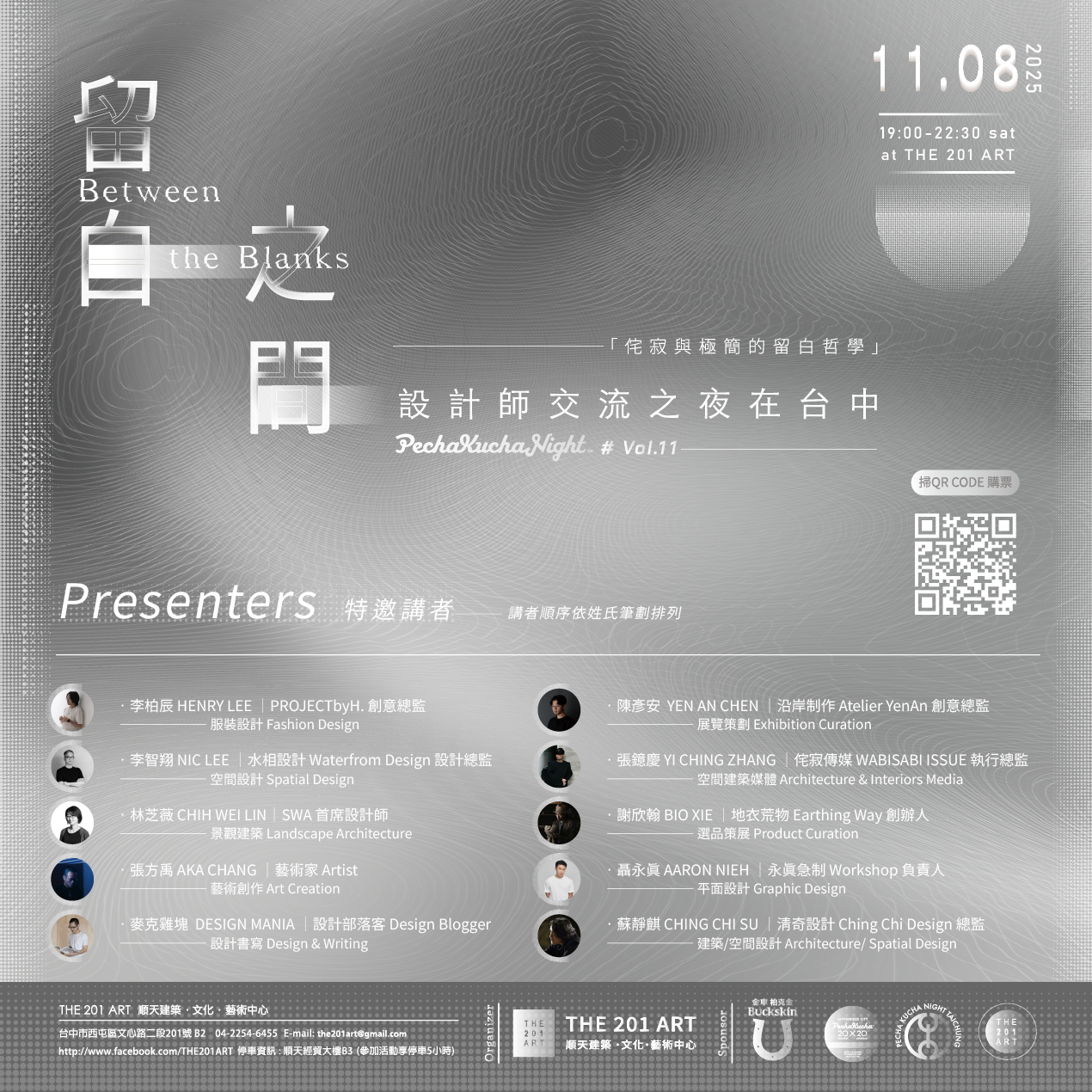 本場座談以 PechaKucha 20x20 的節奏進行,邀請藝術、建築與設計領域創作者,以「空白、時間與材料」為切面,透過作品表述其追求。我們將探問:在面對當代空間與物件創作時,如何在作品中同時容納長存與流動、結構與情感?當留白成為設計語言的核心,它是否也能成為一種更有力量的敘事方式?
