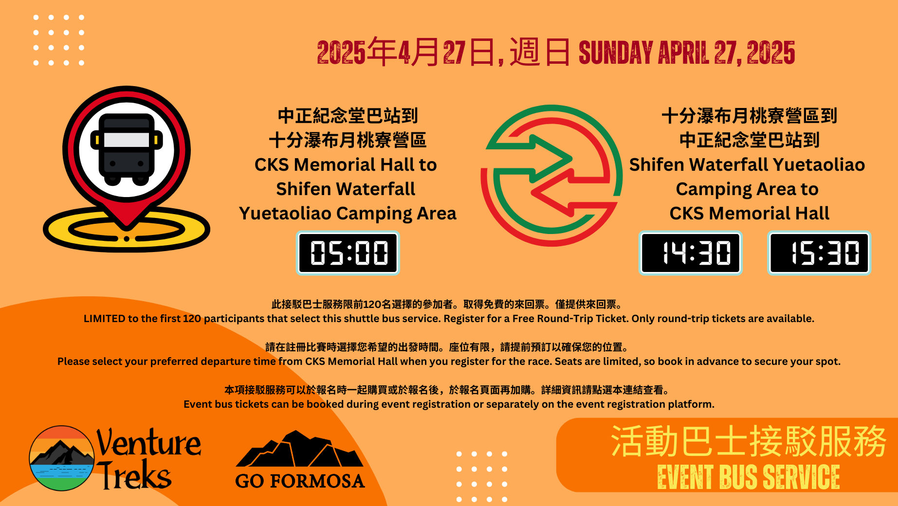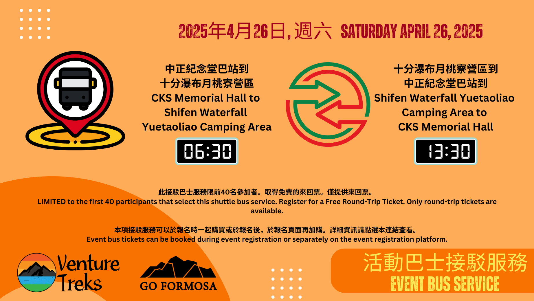 We’re offering FREE and convenient event bus options between Taipei and the Shifen Waterfall Yuetaoliao Camping Area on both days of the event. All buses will pick up and drop off participants at CKS Memorial Hall.