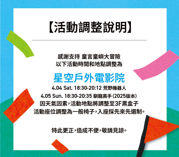 ● 本活動實際播放總時長依現場實際狀況為主,並嚴禁在電影播放期間拍攝、錄影、錄音,以免違反《著作權法》。